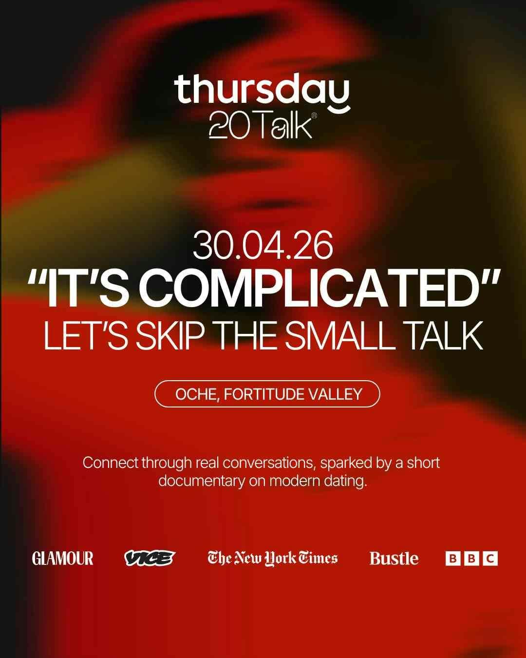 🎬 At 7:30pm, we’ll kick things off with a short 30-minute documentary, “It’s Complicated” — a raw and relatable look at modern dating, love and relationships. Featuring real stories, it explores the highs, the lows and everything in between — designed to spark better, more meaningful conversations throughout the night.