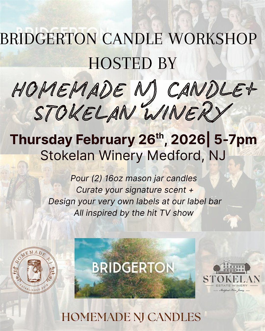 Crafting Experience: Curate your own SIGNITURE scent, Pour (2) 160z mason jar candles that will burn 60-70 hours long, Design your own labels to make a lasting memory! You will have the opprotunity to design your candle based on the hit sereis Bridgerton!
