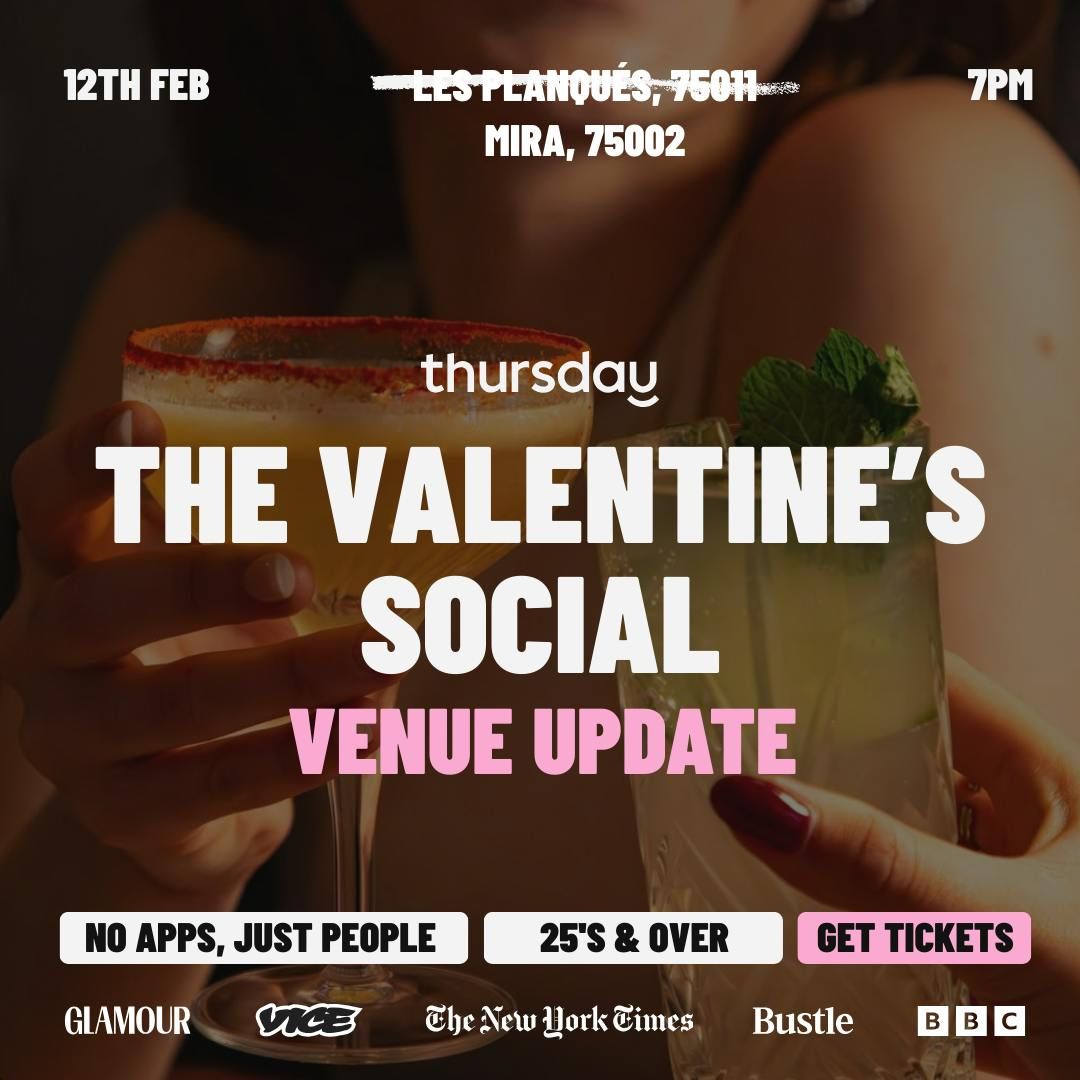 Rendez-vous chez Mira pour une ambiance intimiste et dynamique, avec un DJ set à partir de 20h. Au programme : cocktails créatifs, excellente musique et une salle remplie de célibataires prêts à se rencontrer, danser et profiter.Tous les participants ayant déjà acheté un billet ont été contactés directement concernant le changement de lieu.
