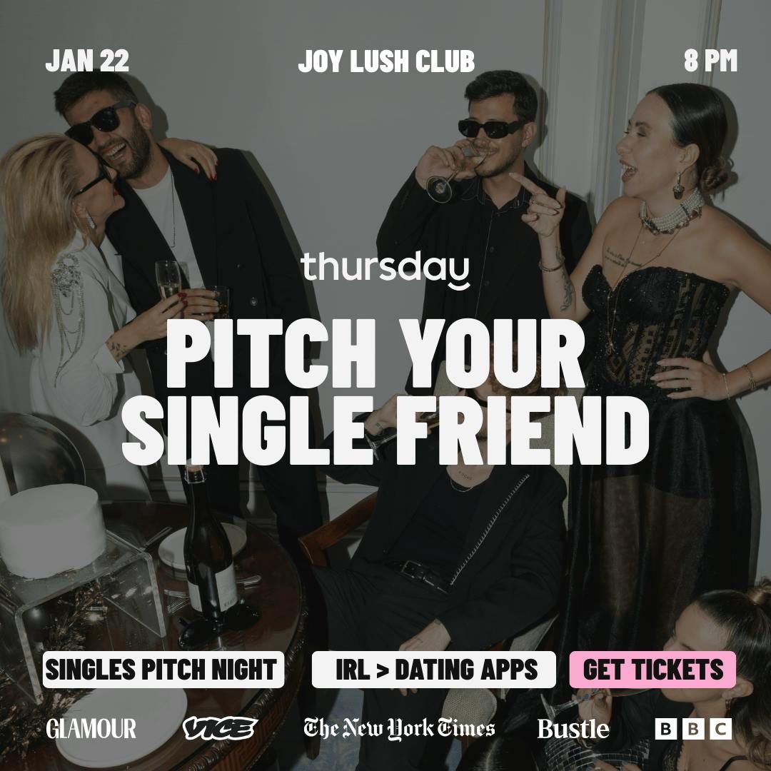 Just a bar, everyone single. Because the world in 2026 is all about meeting IRL, not on dating apps!Forget dating apps — your friends know you best. At this event, you’ll grab a drink, bring your ultimate wingperson to help you find the one for you. Whether you’re pitching, being pitched, or just watching the show, you’re in for a night full of laughs and connection.