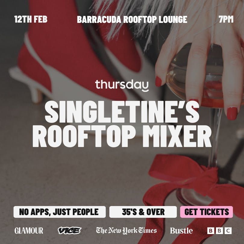 "Singletines" is your hilarious, no-pressure, late-fall lifeline for singles who are 40+. Join us on February 12th to mingle with fellow amazing singles and maybe even snag someone worth deleting your dating apps for! It's a night of sparkling fun, witty conversation, and guaranteed zero third-wheel situations at Barracuda Rooftop Lounge.