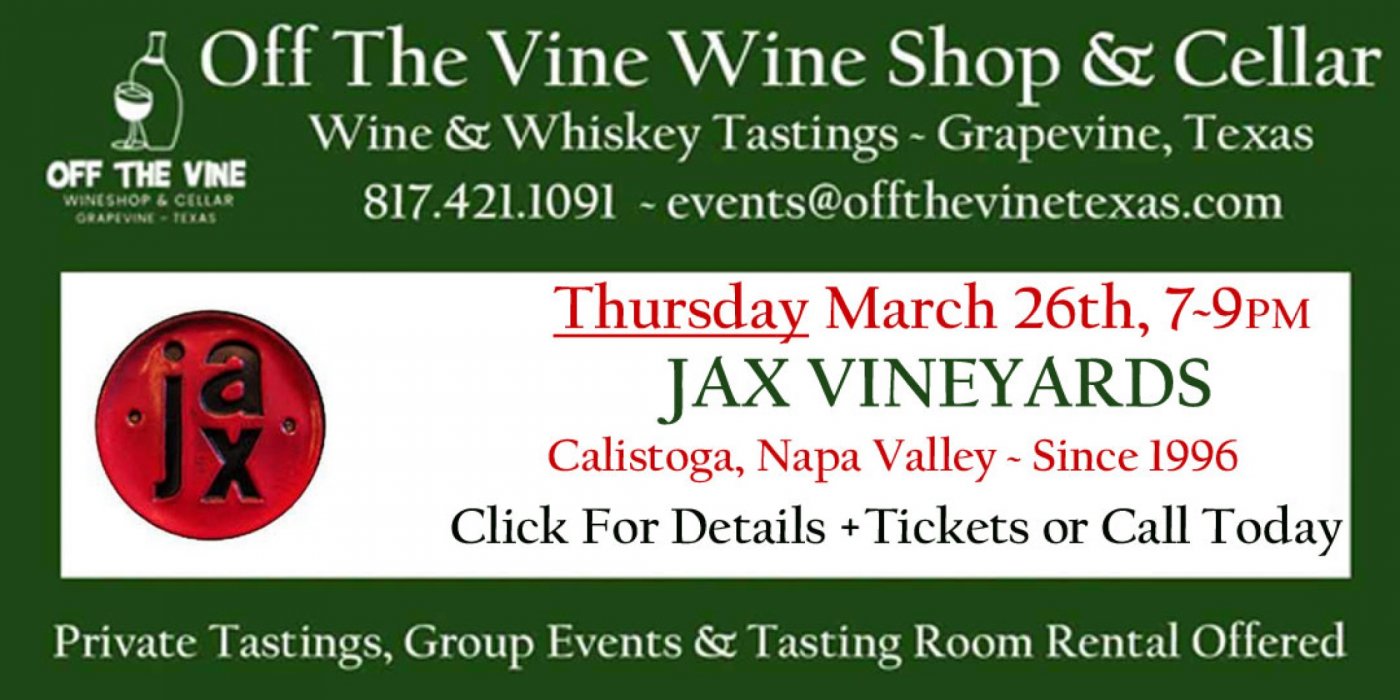 Come Taste with us as we learn more about JAX's sustainability, utilizing modern, small-lot techniques for their refined, balanced, and food-friendly wines style. Six wines, charcuterie served family-style withlight snack and great conversations! 7 - 9:00 PM $65 + tax pp