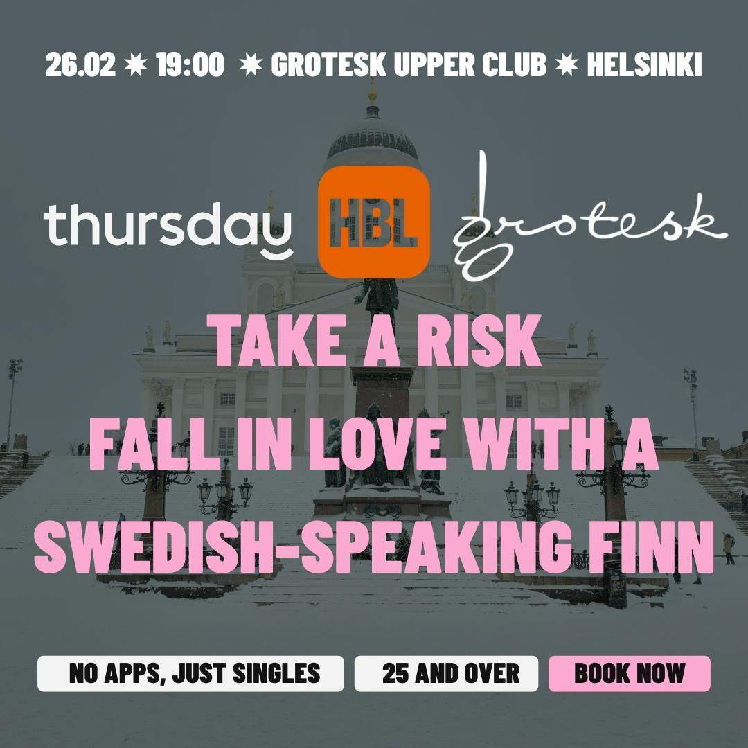 đ„Take a risk and meet a Swedish-speaking Finn! For this special night at Grotesk on Thursday 26th February, we'll celebrate our single Swedish-speaking Finns 𫶠and you can celebrate too! Will you take a chance and join us? The event welcomes all singles 25+, so your language doesn't matter.