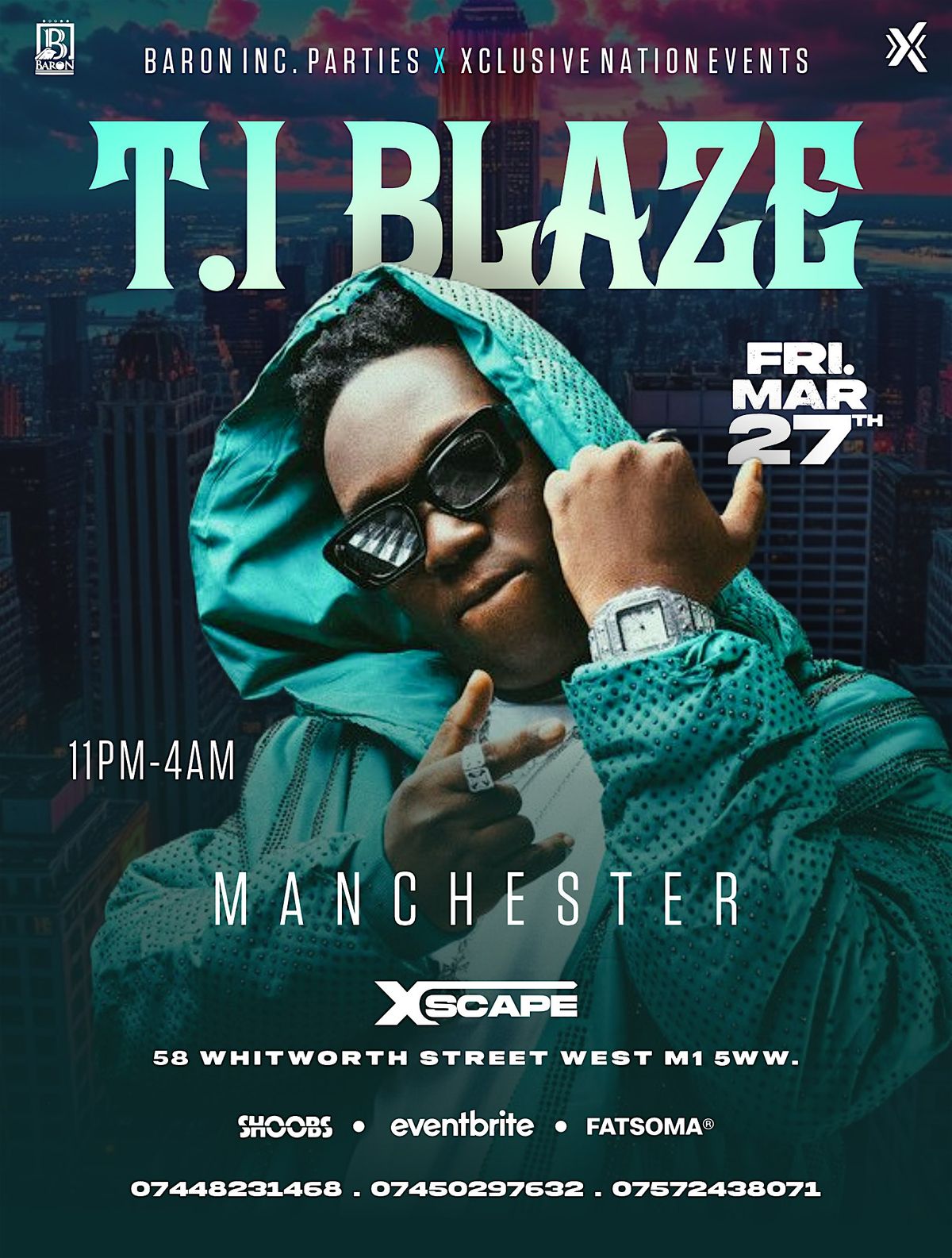 Get ready for a massive night in Manchester as T.I BLAZE shuts down Xscape with an unforgettable live performance and nonstop vibes. Expect the best of Afrobeats, Hip-Hop, Amapiano, RnB and Dancehall from 10pm till 4am, surrounded by high energy, premium nightlife and a crowd that knows how to turn up.