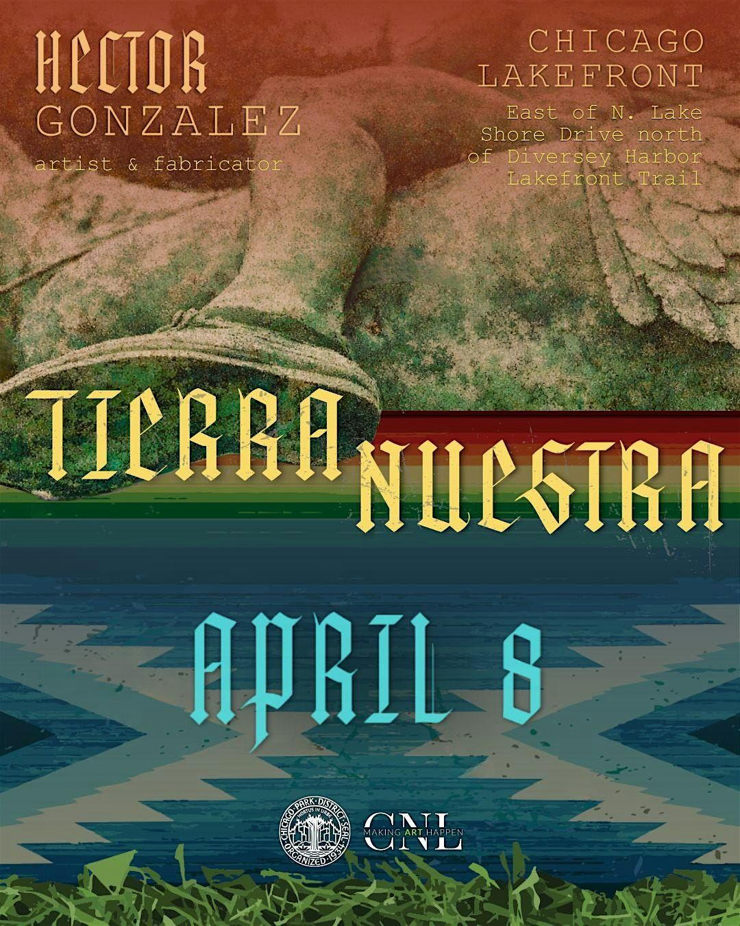 You are cordially invited to the opening reception of TIERRA NUESTRA on Wednesday, April 8, 2026, from 1 PM to 3 PM, at East of N. Lake Shore Drive north of Diversey Harbor, Chicago, IL 60614. Join us for an artist talk, an Aztec Ceremonial Dance Offering by Aztec Dance Chicago and Rudy Sosa, a Grass Dance Grounds Blessing by Negwes White, and a community gathering.