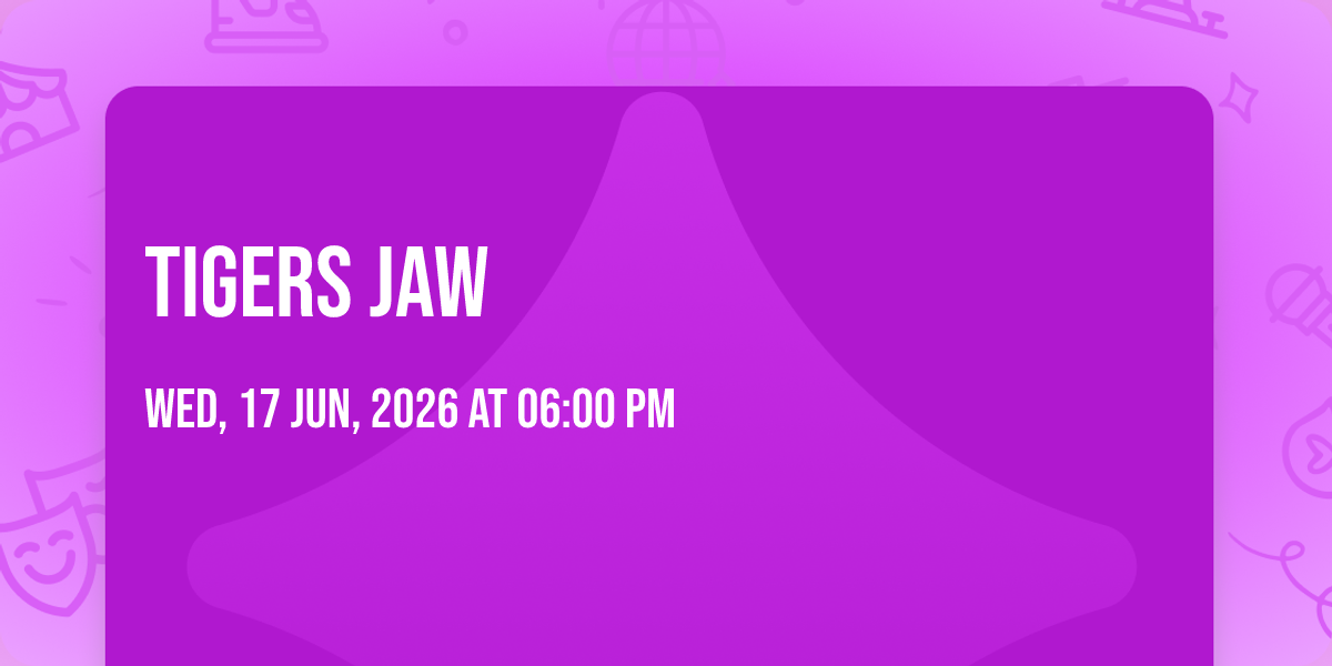 🎉 Welcome to Tigers Jaw, where the impossible becomes possible and dreams take flight! 🏛️ Join us at Wooly's in the heart of Des Moines, IA for an event that will redefine your expectations. 📅 On June 17th, 2026 at 06:00 PM, witness the transformation of space and time into something truly magical. ✨ It's a curated experience combining the best of innovation, entertainment, and community spirit, creating moments that will be remembered for years to come. Whether you're a first-time visitor or a seasoned enthusiast, prepare to be amazed. 🎊 Book now to ensure your place in this unforgettable experience!http://maps.seatics.com/GeneralAdmissionEvent_2018-10-03_1713_SVGC_tn.gif