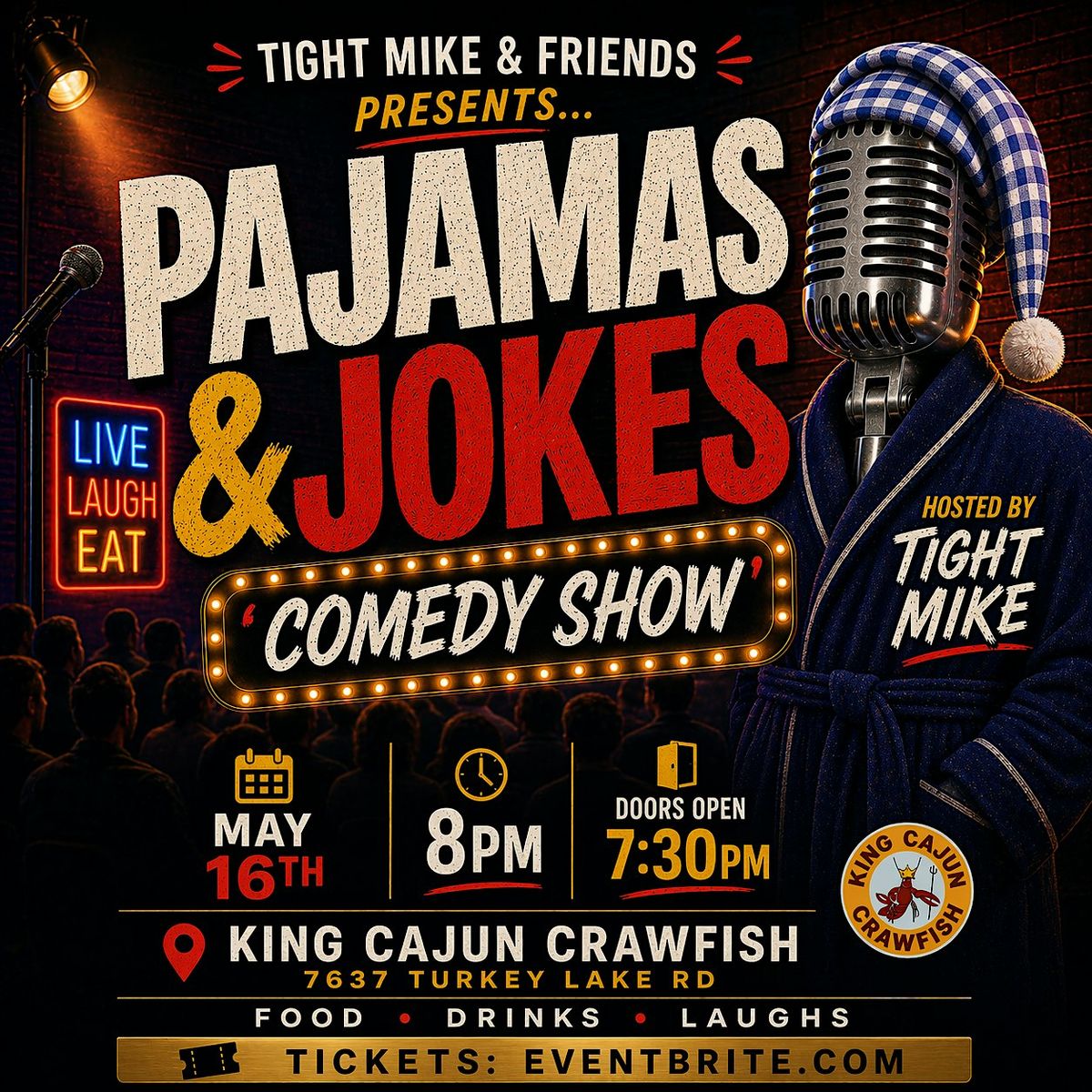 Get ready for a fun night in person with Tight Mike and friends! Put on your comfiest pajamas, bring your best laughs, and join us for a laid-back evening full of hilarious jokes and good vibes. It’s the perfect chance to chill, joke around, and enjoy some quality time with a great crew. Don’t miss out on the laughs!
