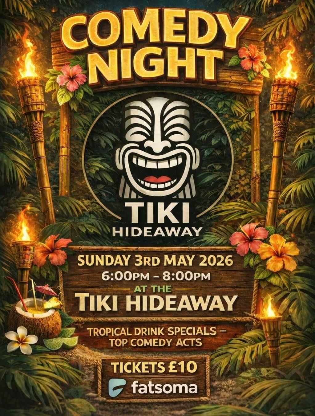 🌴🎤 Stand-Up Comedy Night at Tiki Hideaway 🎤🌴Escape to the laughs! Join us Saturday, 3rd May 2026 for a night of killer punchlines, tropical vibes, and rum-fueled giggles at Tiki Hideaway.