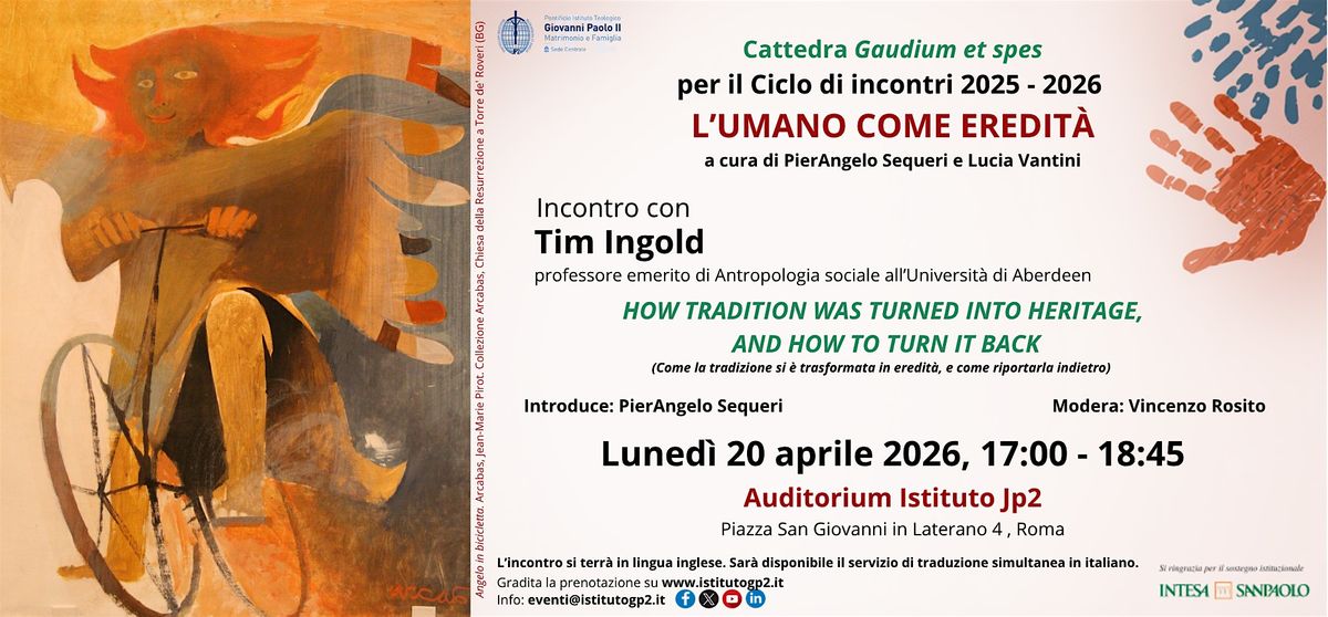 Dopo il primo incontro di presentazione del manifesto della Cattedra - - e dell'orizzonte della riflessione proposta (rivedi qui l'evento L'Umano come Eredità e la Filosofia della Nascita) il secondo appuntamento, previsto lunedì 20 aprile 2026 dalle 17.00 alle 18.45, sarà un incontro con Tim Ingold, professore emerito di Antropologia Sociale all'Università di Aberdeen in Scozia che negli ultimi anni si è dedicato alla divulgazione del suo pensiero anche al di fuori dell'Accademia.