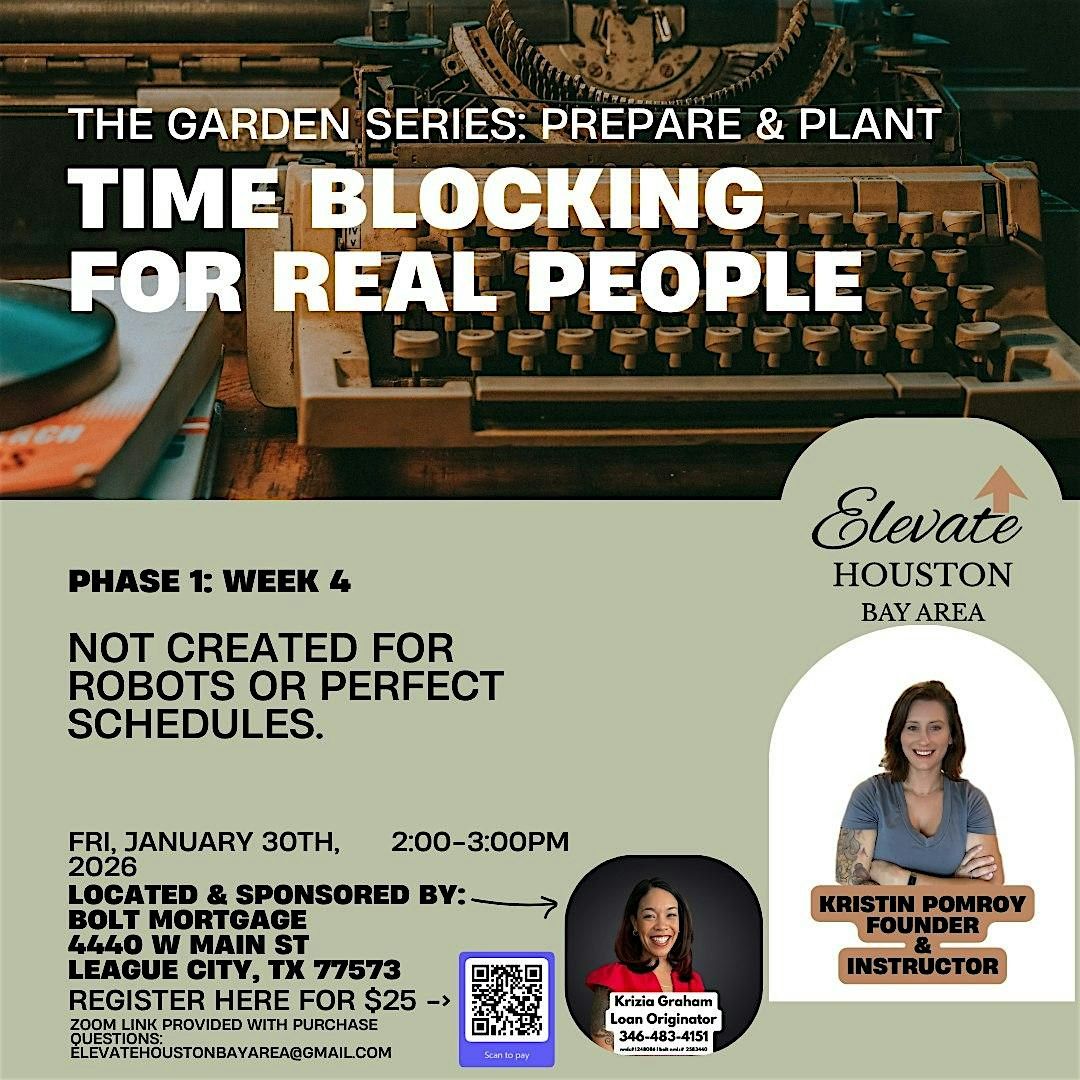 Ready to take control of your day? Join us in person (or Zoom link provided at purchase) for a laid-back, practical workshop all about time blocking. No fancy jargon, just real tips to help you organize your schedule, boost productivity, and actually get stuff done. Whether you're a busy professional or just looking to manage your time better, this event is for you. Come hang out, learn, and leave with a plan that works in the real world! Not created for robots or perfect schedules. Learn a realistic time-blocking method that adapts to your actual life, kids, clients, and chaos. This is the system that helps you stay consistent even when life gets messy.