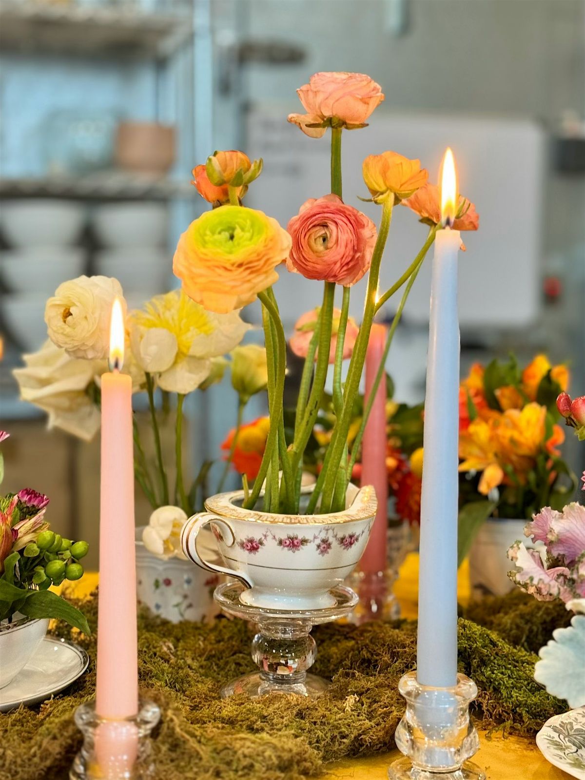 You’ll learn the fundamentals of working in small vessels—how to build structure, choose the right blooms, and create balance at a smaller scale. While we’ll be designing in teacups, these techniques easily translate to other compact containers like bud vases, bowls, and collected vessels from home.
