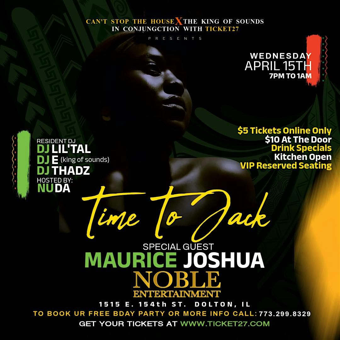 Get ready for an unforgettable night of house music at Time To Jack! Featuring Grammy Award-winning DJ and headliner Maurice Joshua, this event brings high-energy vibes, top-tier sound, and nonstop dancing. Join DJ Lil Tal, DJ E (King of Sounds), and DJ Thadz, hosted by Nuda, for an electrifying experience with drink specials, kitchen open, and VIP seating available.