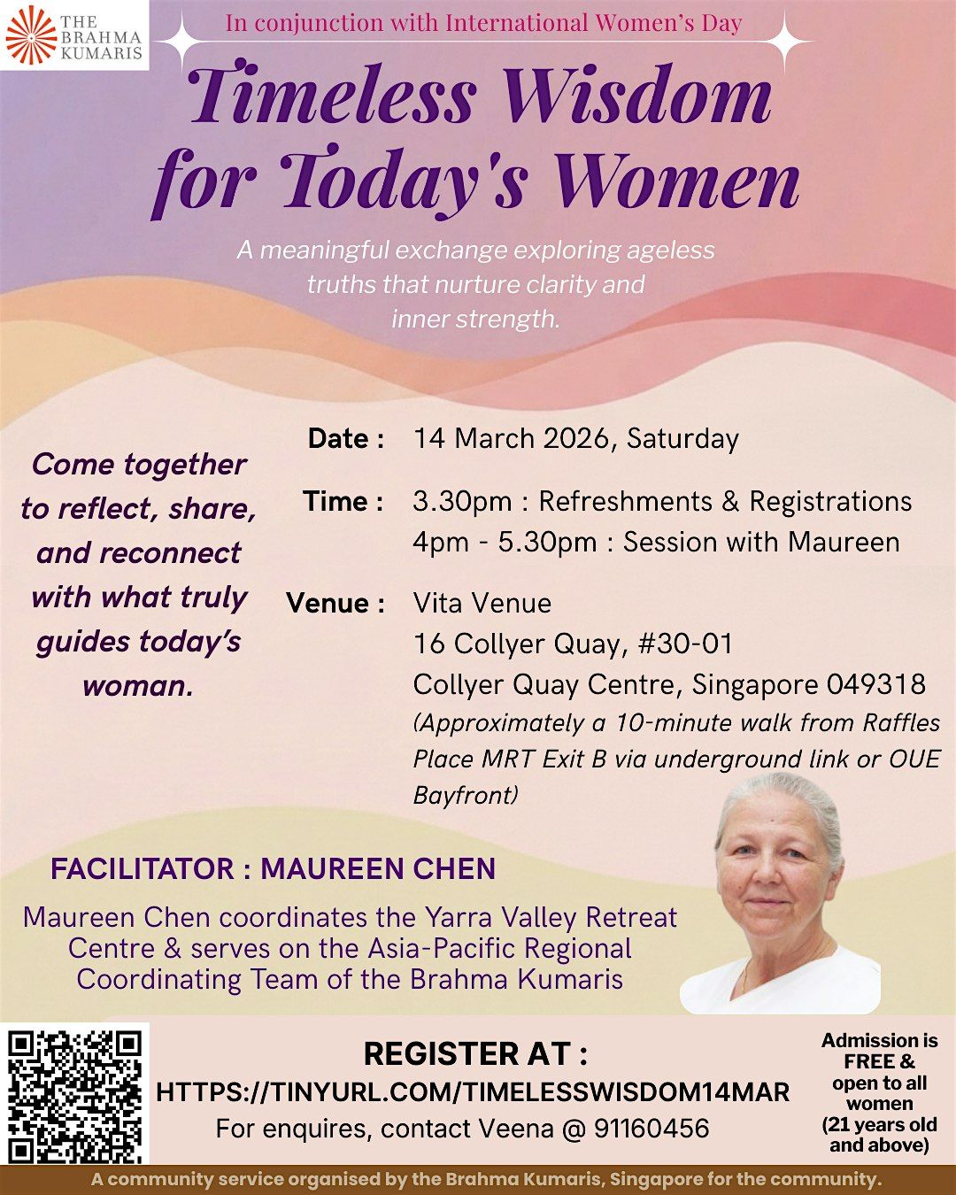 #InternationalWomensDay #TimelessWisdom #WomensCircle #InnerStrength #BrahmaKumaris #WomenSupportingWomen #SingaporeEvents