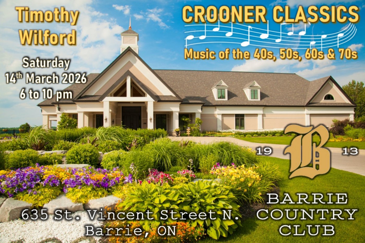 On Saturday, 14th March 2026, 6-10pm, Timothy Wilford will be performing his solo-singing act at the BARRIE COUNTRY CLUB. Club members and guests will enjoy dinner and the music of Frank Sinatra, Dean Martin, Hank Williams, Elvis Presley, Neil Diamond, and many more!