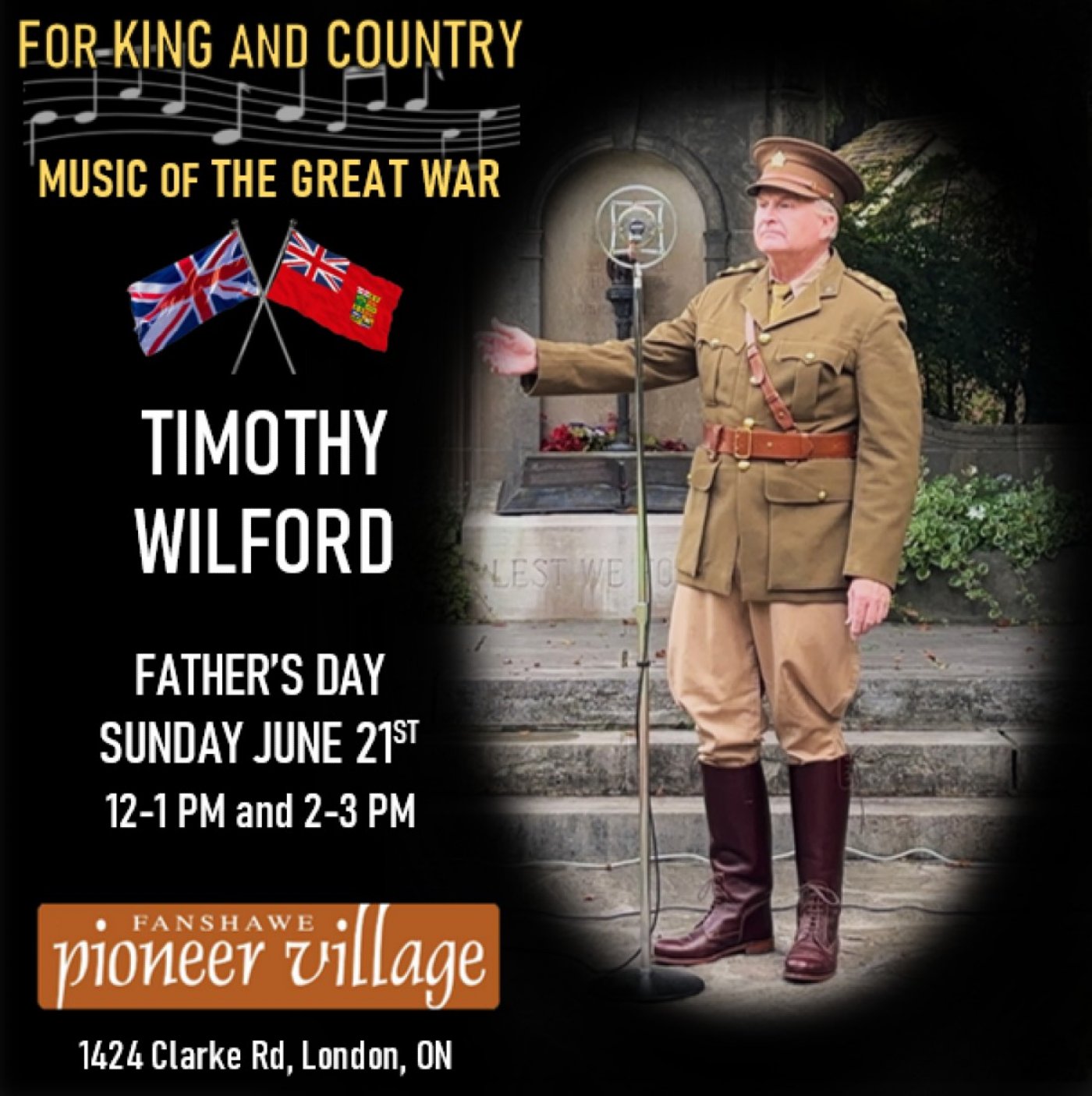 On Father's Day, Sunday, 21st June 2026, bring dad & grandad to the FANSHAWE PIONEER VILLAGE in London, where Timothy Wilford will be performing Music of The Great War. Enjoy the exhibits, setting, and music of a bygone era. Do attend for King and Country!