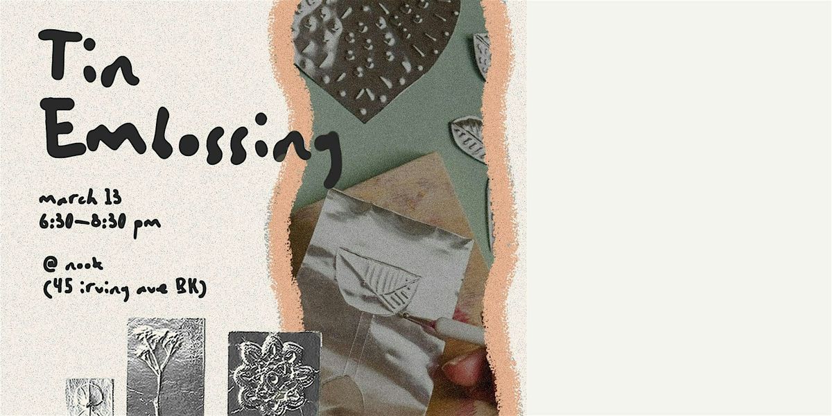 For this event, we'll be doing a tin embossing workshop where you will receive all materials and tools necessary to create an embossed piece of art. Please look at our TINSPO! page for ideas of what you can make.