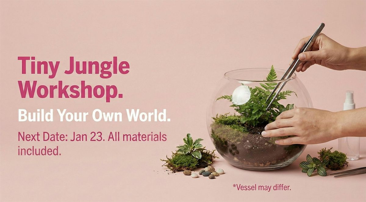 Get ready to bring a piece of the jungle right to your home! Join us in person for the Tiny Jungle - Terrarium Workshop where you’ll create your own mini green paradise. It's super fun and perfect for all skill levels. You’ll get to pick from a variety of plants and decorations to design a unique terrarium that fits your vibe. Come hang out, get creative, and take home a little jungle of your own!