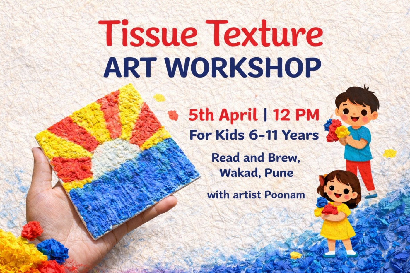 Let your child explore creativity in a fun and hands-on way! Join us for a vibrant Tissue Texture Art Workshop where kids will learn to create beautiful textured artwork using simple materials like tissue paper.