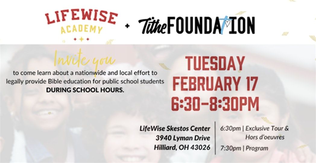 We are excited to announce an exclusive Tithe Business Partner night hosted by Lifewise Academy. LifeWise Academy is a non-profit that provides Bible-based character education to public school students during school hours. Started right here in Ohio - demand in nearly all 50 states has been exploding. We are lucky to have thier headquaters and founding team as local Columbus residents and friends of the Foundation. On 2/17 they will be hosting our Tithe Business Partners and friends for an exlusive tour of their new facilities in Hilliard, along with giving us a sneak peak at where they've been, what's happening today, and the vision for Lifewise in the future. **This is not a formal Grant Night, and there will not be a specific ask for donation on 2/17, however there will be clear ways on how you could assist the mission of Lifewise locally or nationally if their vision stirrs you to do so. Please join us!