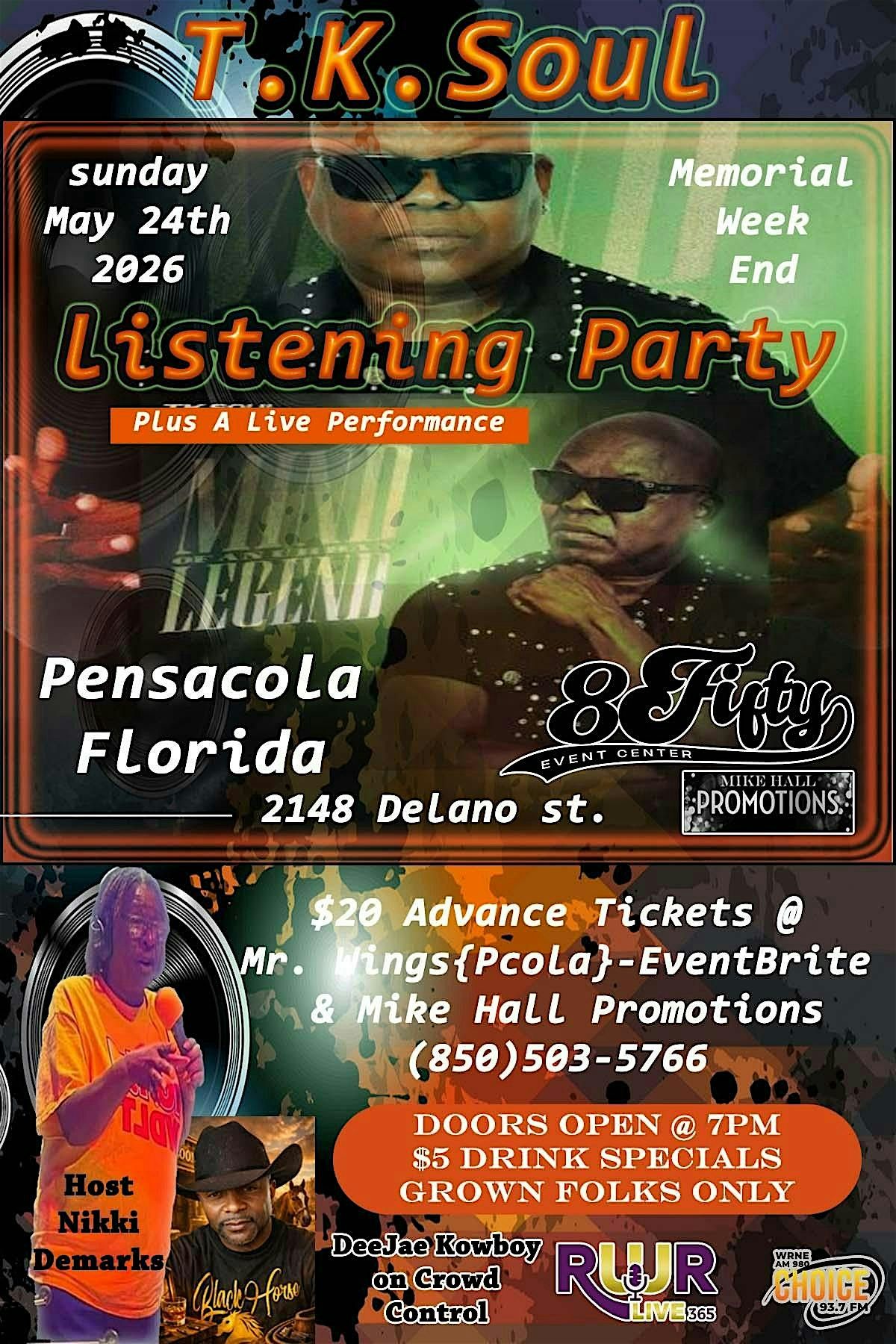 Tk Soul Live @ 8 Fifty Event Center Pensacola Fl. Sunday May 24th 2026 7pmAbout this Event