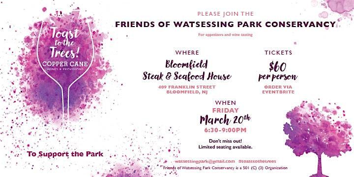 The Friends of Watsessing Park is a group of dedicated individuals committed to mobilizing the community to preserve and enhance the beautiful Watsessing Park, located in Bloomfield and East Orange, New Jersey. We hope you will join us as we Toast to the Trees. The funds we raise at this event will go towards all of the conservancy's efforts including planting new trees, maintaining a pollinator garden and preserving the character of Watsessing Park for future generations.