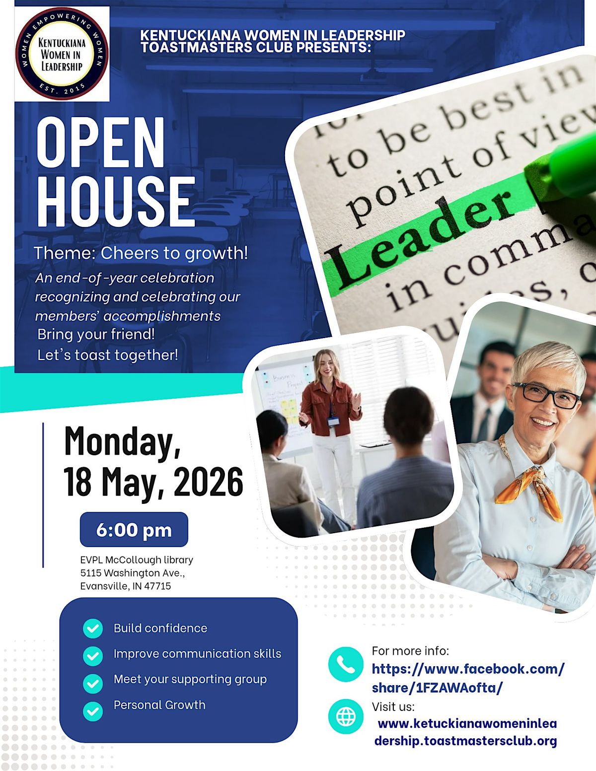 Kentuckiana Women in Leadership Toastmasters club is hosting an open house May 18th. Learn how you can improve your skills with us.About this Event