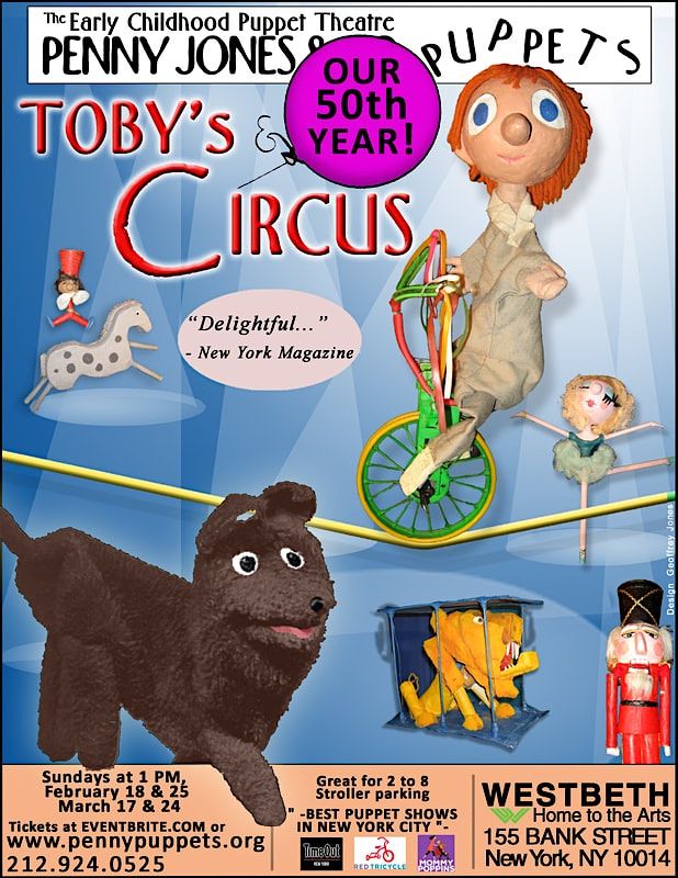 Toby, that silly little dog, is bringing the Circus back to town with Horses, Elephants, Ballerinas, and Lions. Sebastian is a boy who really wants to join the Circus, but will he be able to find his place in the show. With lots of fun for the very young. Make a puppet after the show to take home. We are so happy to bring this big show back. With Jack the Pied Piper and more. Llots of fun for the very young. This is interactive puppet theater for young children in an intimate setting. The company has been performing in the Village for 50 years. Make a puppet after the show to take home. Don't miss the Circus.