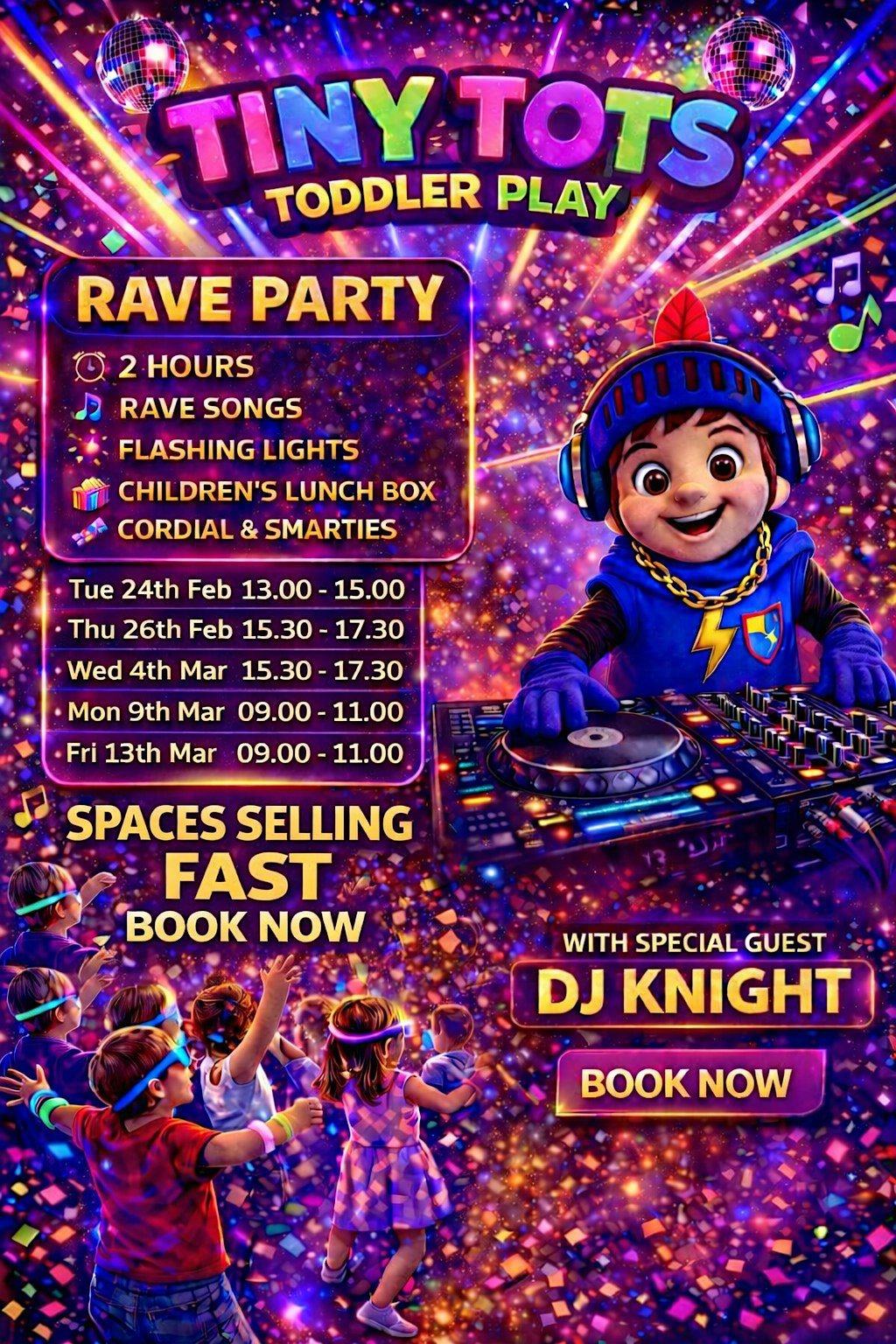 Tiny Tots Toddler Play Rave Party is a high-energy, fun-filled 2-hour disco experience designed especially for little ones!