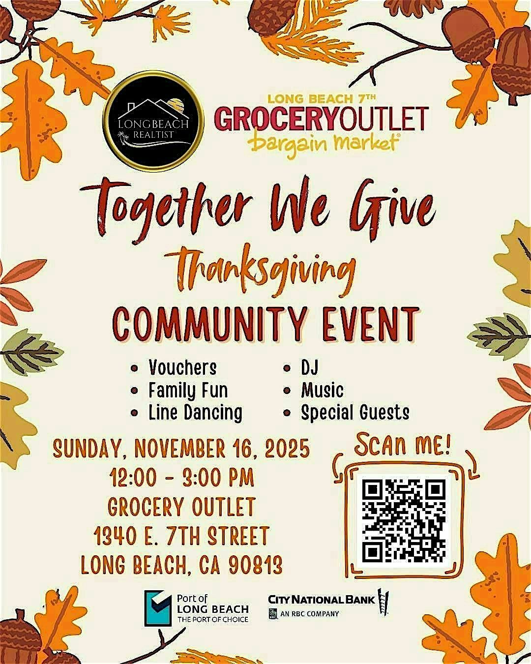 The Long Beach Realtist Association presents the first-ever Together We Give: Thanksgiving Community Free Event, hosted in partnership with Grocery Outlet and supported by the Port of Long Beach, City National Bank and U.S. Bank.