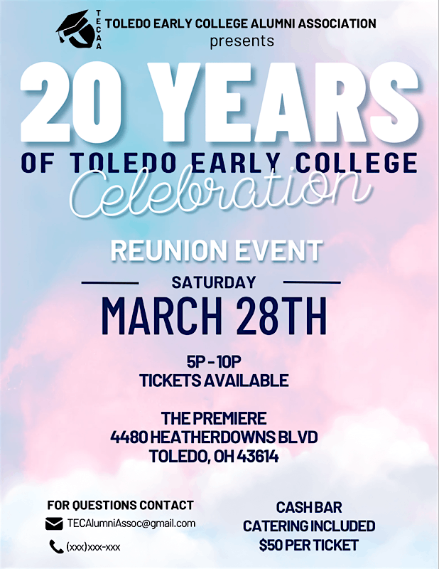 Come connect with 20 years of Alumni and Faculty from Toledo Early College (TEC) High School and learn about the TEC Alumni Association and what they've been working on for TEC Alumni and current students. Catered dinner will be provided and meal options are included as part of your ticket purchase.