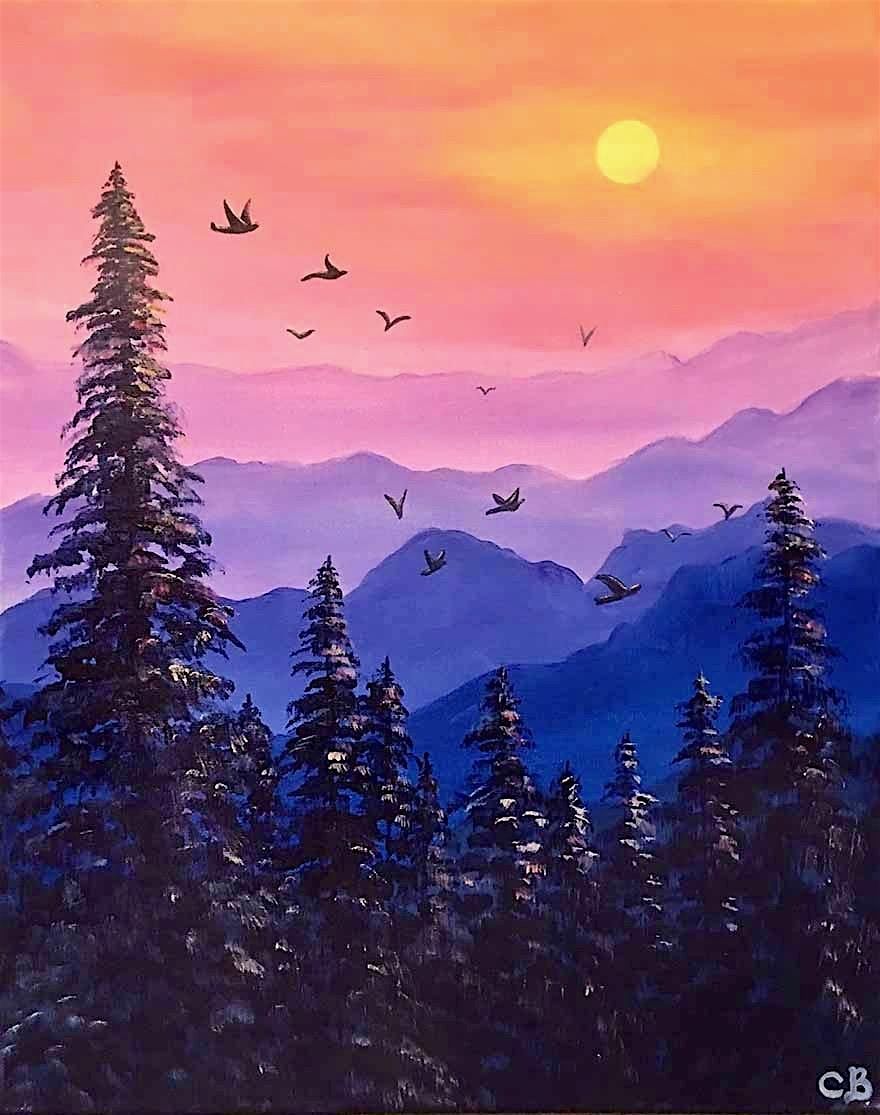 Join us at Wine & Canvas Studio for Atop the Canopy, a stunning Paint & Sip experience inspired by colorful mountain sunsets and quiet forest landscapes. This vibrant scene features deep blue pine trees rising from the foreground, soft purple mountain layers fading into the distance, and a glowing golden sun suspended in a warm evening sky.
