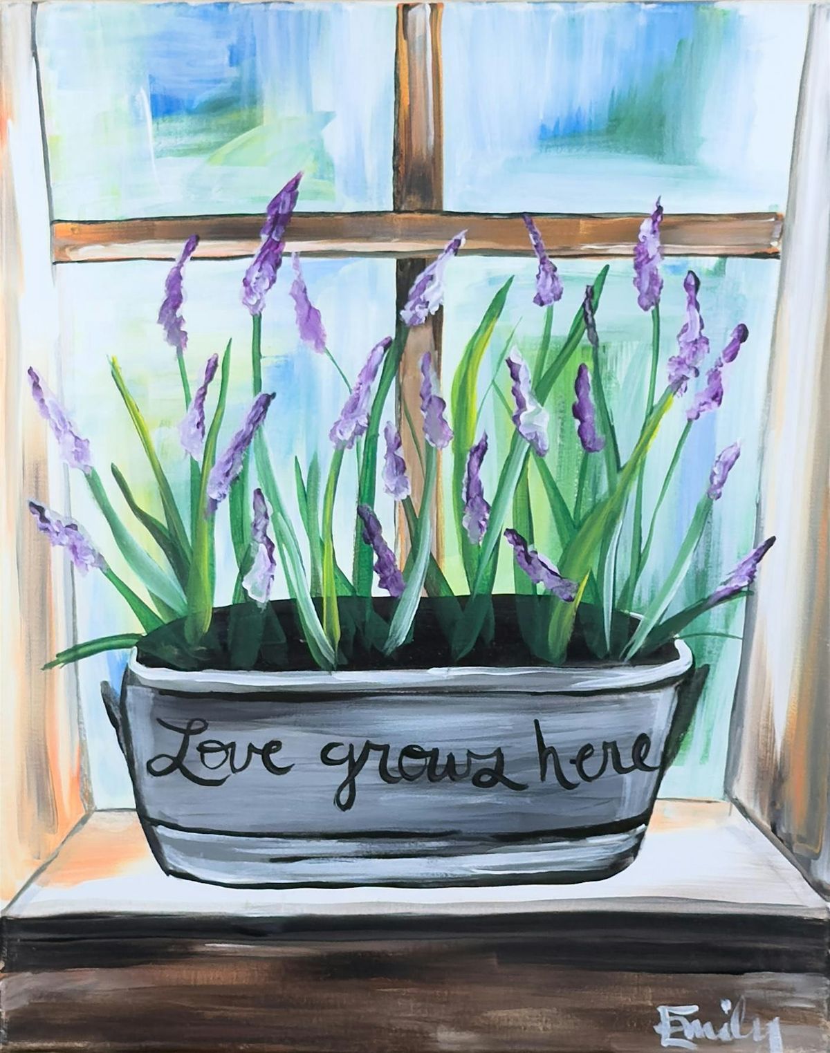 Join us at the Wine & Canvas Studio for Love Grows Here, a warm and welcoming Paint & Sip Party inspired by simple spring moments at home. This cozy design features blooming lavender growing in a planter on a sunny windowsill, with gentle brushstrokes and calming colors that feel peaceful, hopeful, and heartfelt.
