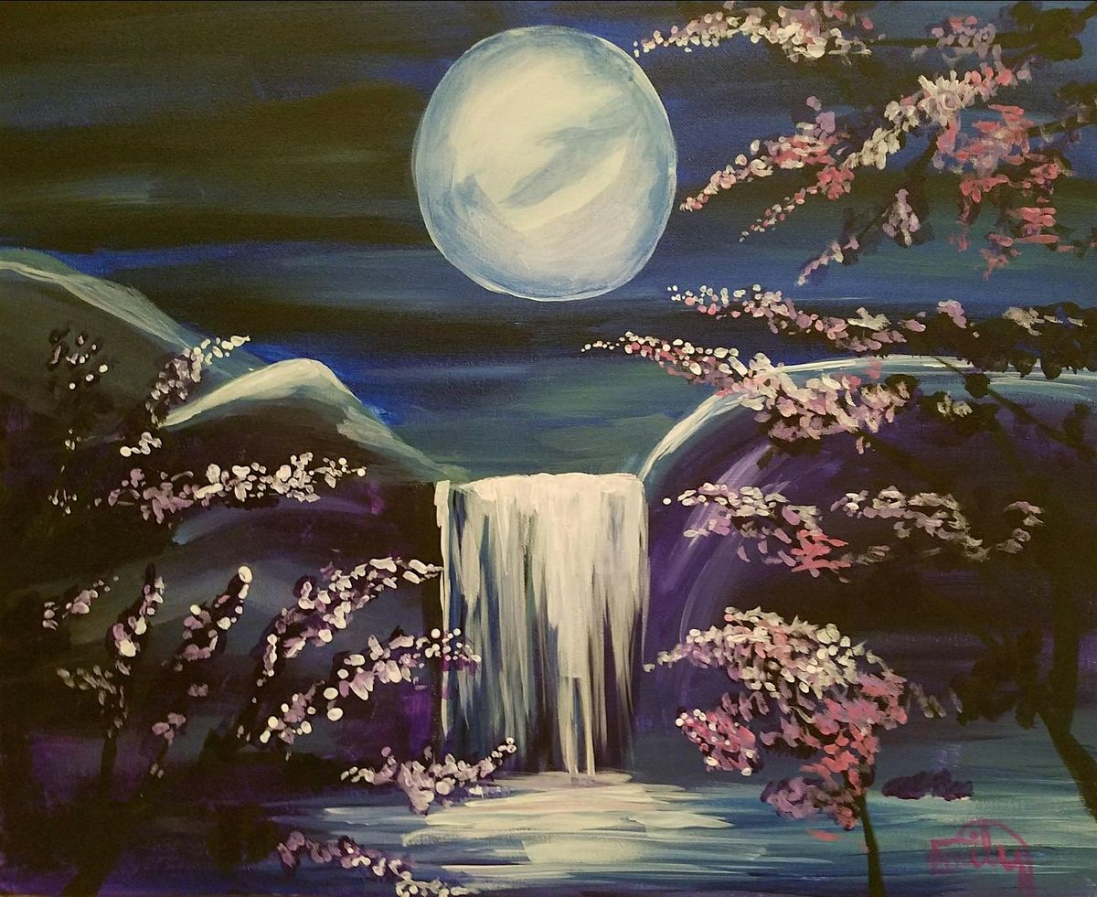 Join us at Wine & Canvas Studio for Purple Falls, a serene Paint & Sip experience inspired by tranquil nightscapes and softly glowing landscapes. This dreamy design features a cascading waterfall illuminated beneath a luminous full moon, surrounded by rich purple tones and delicate blooming branches.