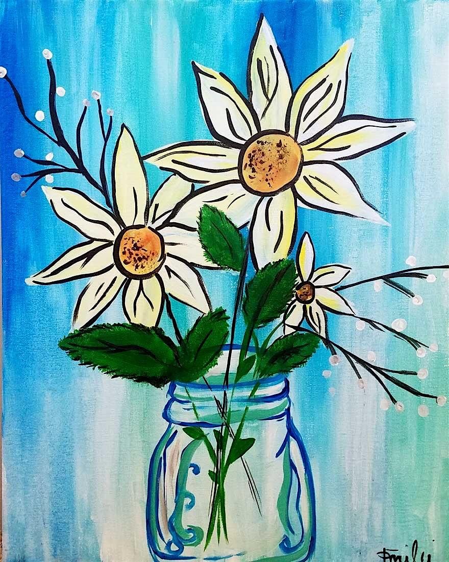 Join us at the Wine & Canvas Studio for Spring Daisies, a cheerful Paint & Sip Party celebrating simple spring beauty. This uplifting design features crisp white daisies with sunny yellow centers arranged in a mason jar, set against a soft blue background that feels fresh, light, and full of possibility.