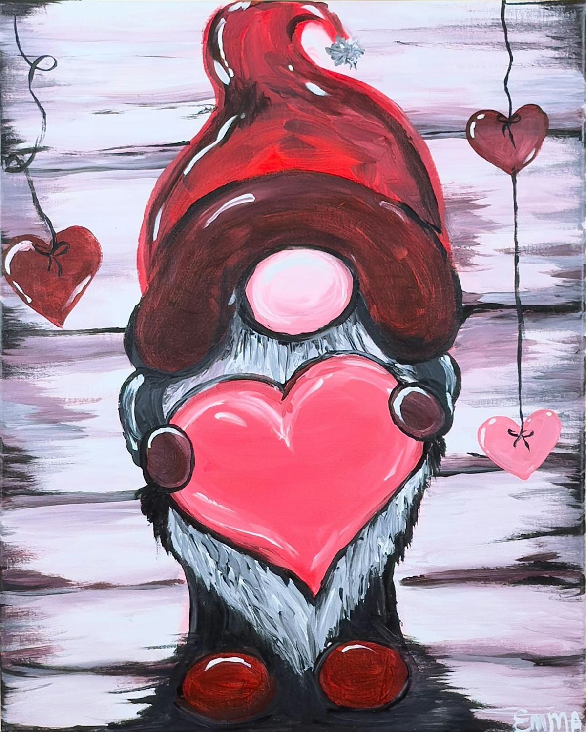 Join us at the Wine & Canvas Studio for Valentine’s Gnome, a fun and festive Paint & Sip Party featuring an adorable gnome holding a bright pink heart, set against a rustic, cozy background with floating Valentine accents. With rich reds, soft pinks, and charming details, this painting brings together whimsy, warmth, and seasonal cheer.