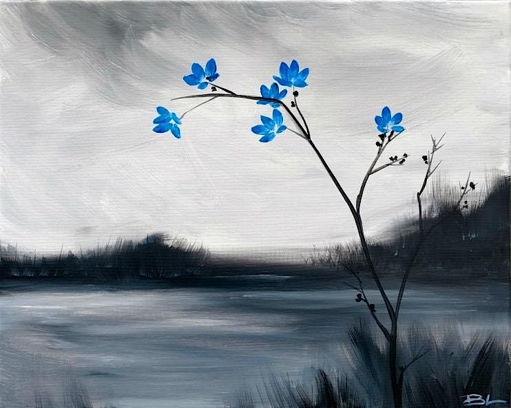 Join us at the Wine & Canvas Studio for Winter Flowers, a serene Paint & Sip Party inspired by the beauty of resilience in winter. This calming design features delicate blue blossoms reaching from bare branches over a quiet, icy landscape beneath a soft gray sky.