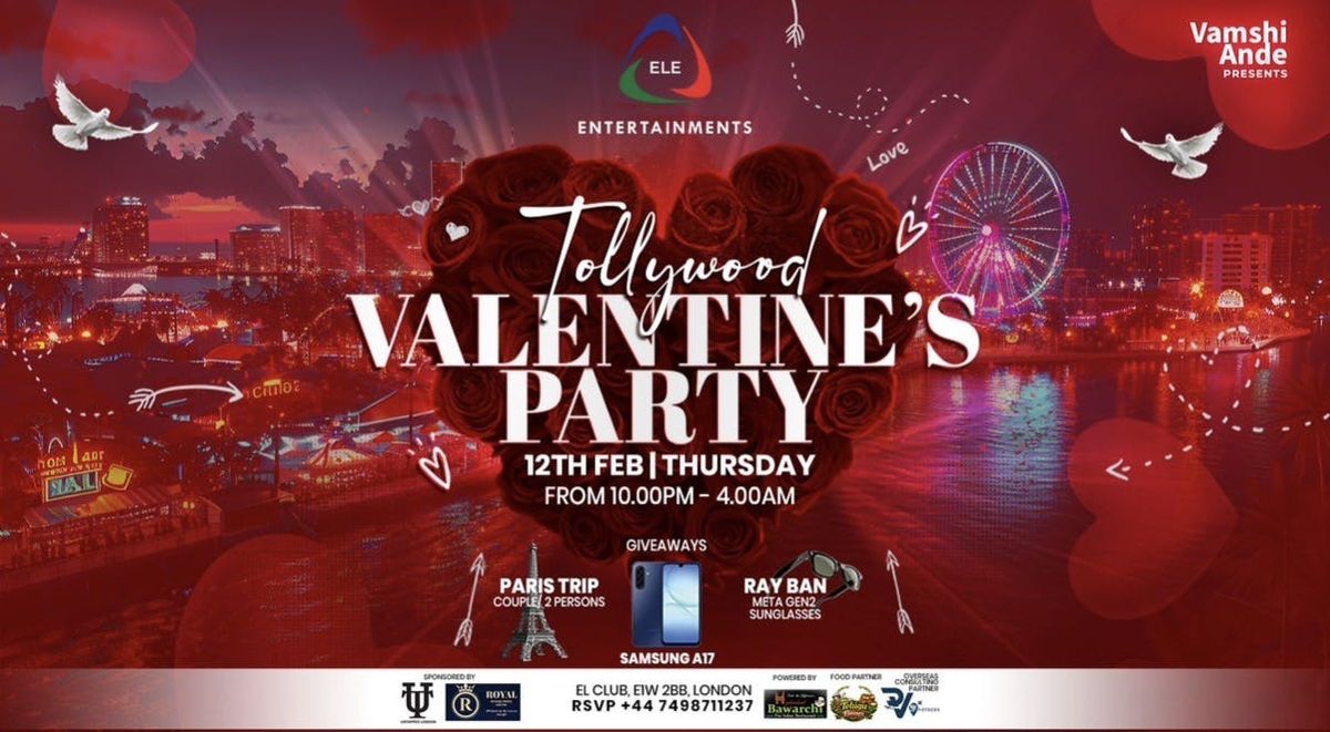 Love is calling… and Tollywood is answering ❤️✨This Valentine’s season, step into a night where romance meets rhythm and love meets celebration 💃🕺Get ready for the Tollywood Valentine’s Party — an unforgettable evening filled with electrifying Tollywood beats, stunning visuals, romantic vibes, and non-stop dancing till the early hours 🔥🌹