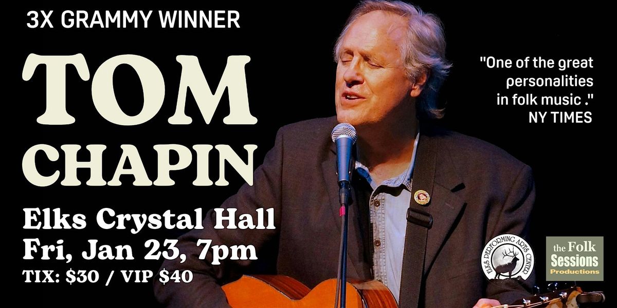 In a career that spans six decades, 27 albums and three GRAMMY awards Tom Chapin has covered an incredible amount of creative ground. In addition to his work as a recording artist, concert performer, storyteller, and activist, he’s performed on Broadway and worked extensively in television, radio and film. On Friday, January 23, Tom brings his “insightful, heartfelt songcraft and effortlessly charismatic live performance” to the Elks Crystal Hall, Third Floor. Tickets are $30- $40. Cash Bar.
