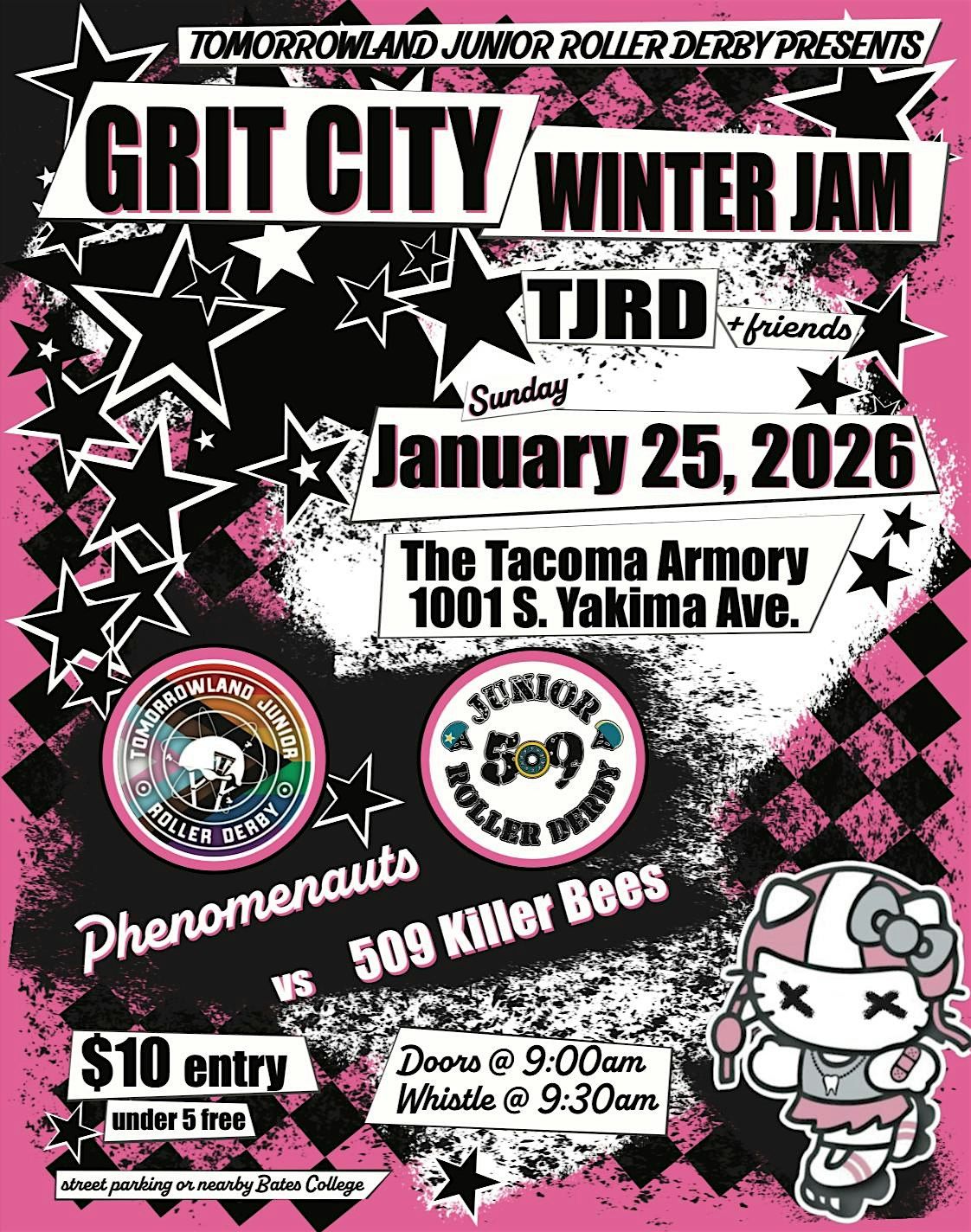 Let’s get this season rolling with our first home bout! Cheer on skaters in an exciting junior roller derby bout between The Tomorrowland Junior Roller Derby Phenomenauts and The 509 Killer Bees!