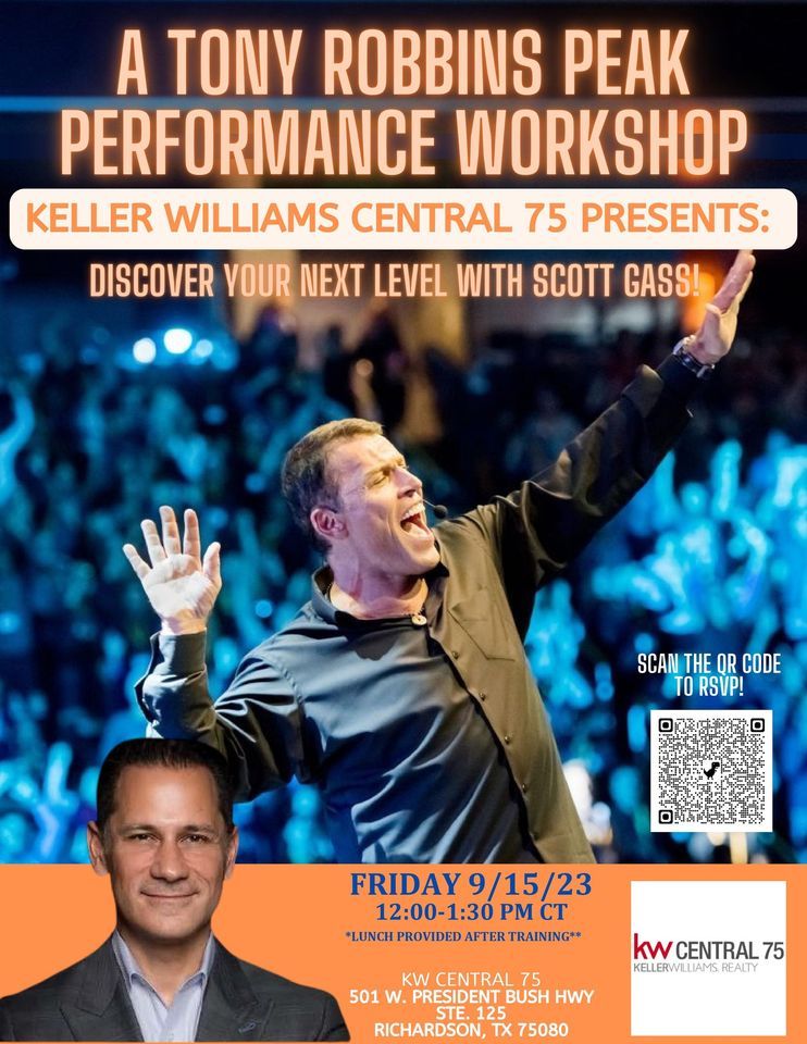 Must RSVP: https://events.blackthorn.io/80dgRC6/5a8UHr2EaYiLIVE/in-house Peak Performance Strategy Workshop with Tony’s TOP certified trainer, Scott Gass, to help us create a MASSIVE ACTION PLAN for the remainder of 2023! Join us on Friday 9/15/2023 at 12pm CT! Be sure to RSVP to save your spot & receive a BONUS GIFT afterwards!
