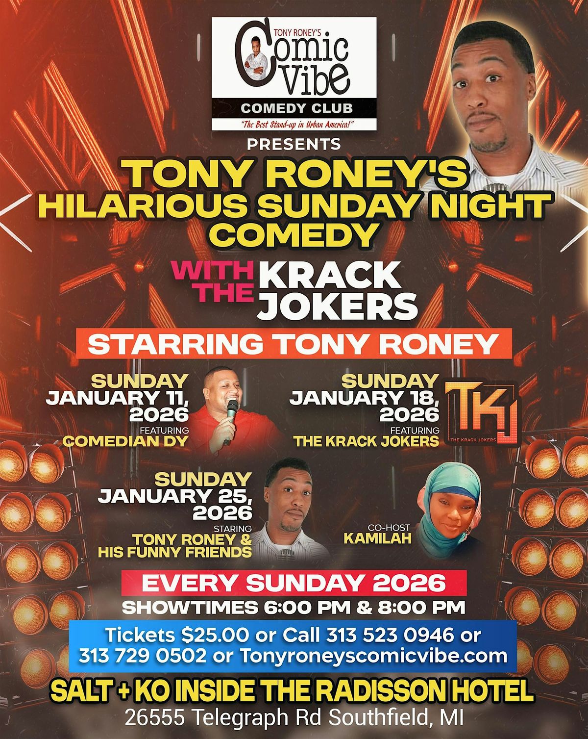 Tony Roney’s Comic Vibe Presents “Tony Roney’s Hilarious Sunday Night Comedy, Every Sunday @ Salt + Ko Inside The Radisson Hotel 26555 Telegraph Rd Southfield, MI. Show Time 6 pm. Tickets $25.00 . This comedy show will showcase Detroit's funniest up and coming comedians. Sponsored by Tony Roney's Comic Vibe. For more info contact Kamilah @ 313 729 0502 or 248 906 6119.