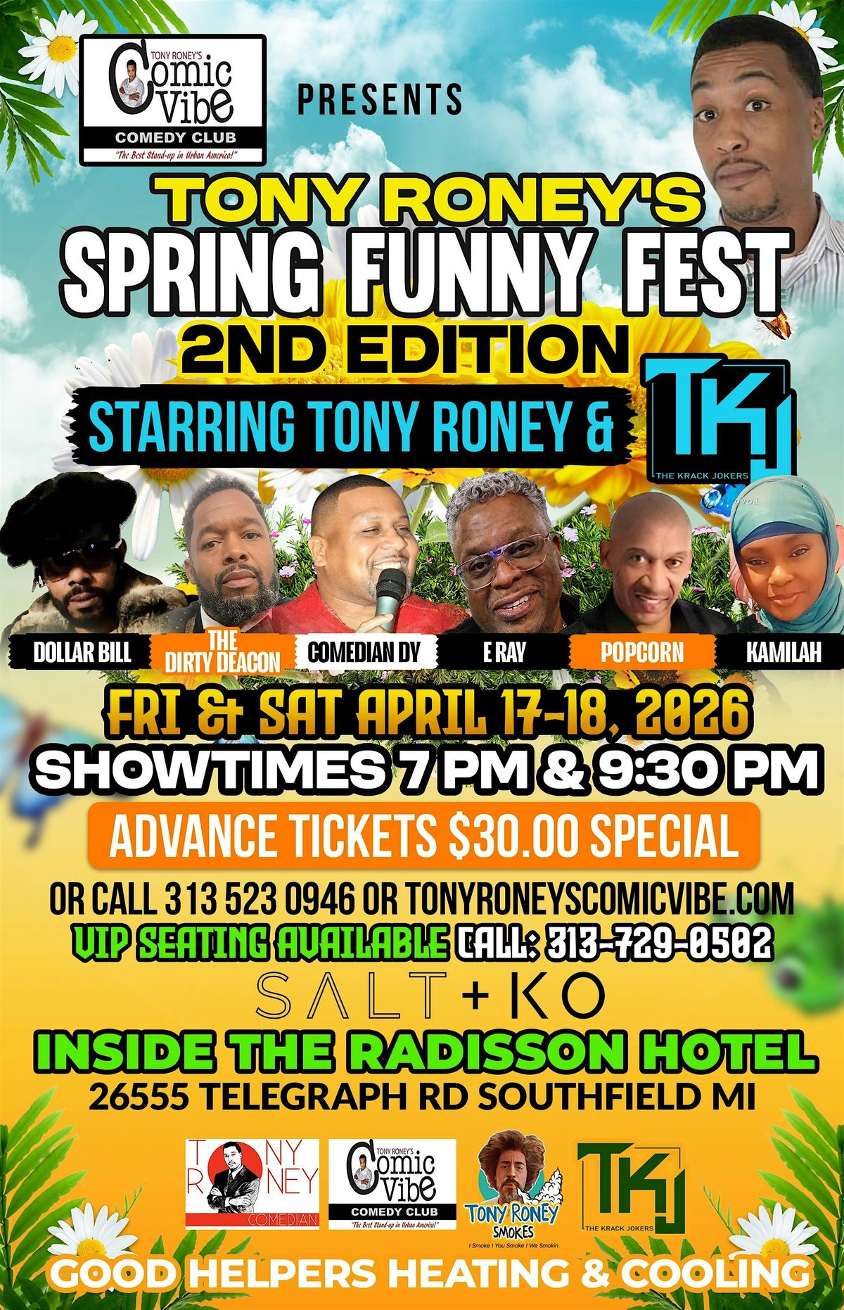 Tony Roney’s “Spring Funny Fest , Friday & Saturday April 17 & 18, 2026 @ The Radisson Hotel 26555 Telegraph Rd Southfield, MI. Show Times 7pm & 9:30 pm. Tickets $30.00. VIP seating available for slightly Higher. This comedy show will showcase Detroit's funniest up and coming comedians. Sponsored by Tony Roney's Comic Vibe. For more info contact 313 523 0946. Slightly higher priced VIP options are available online and at the door.