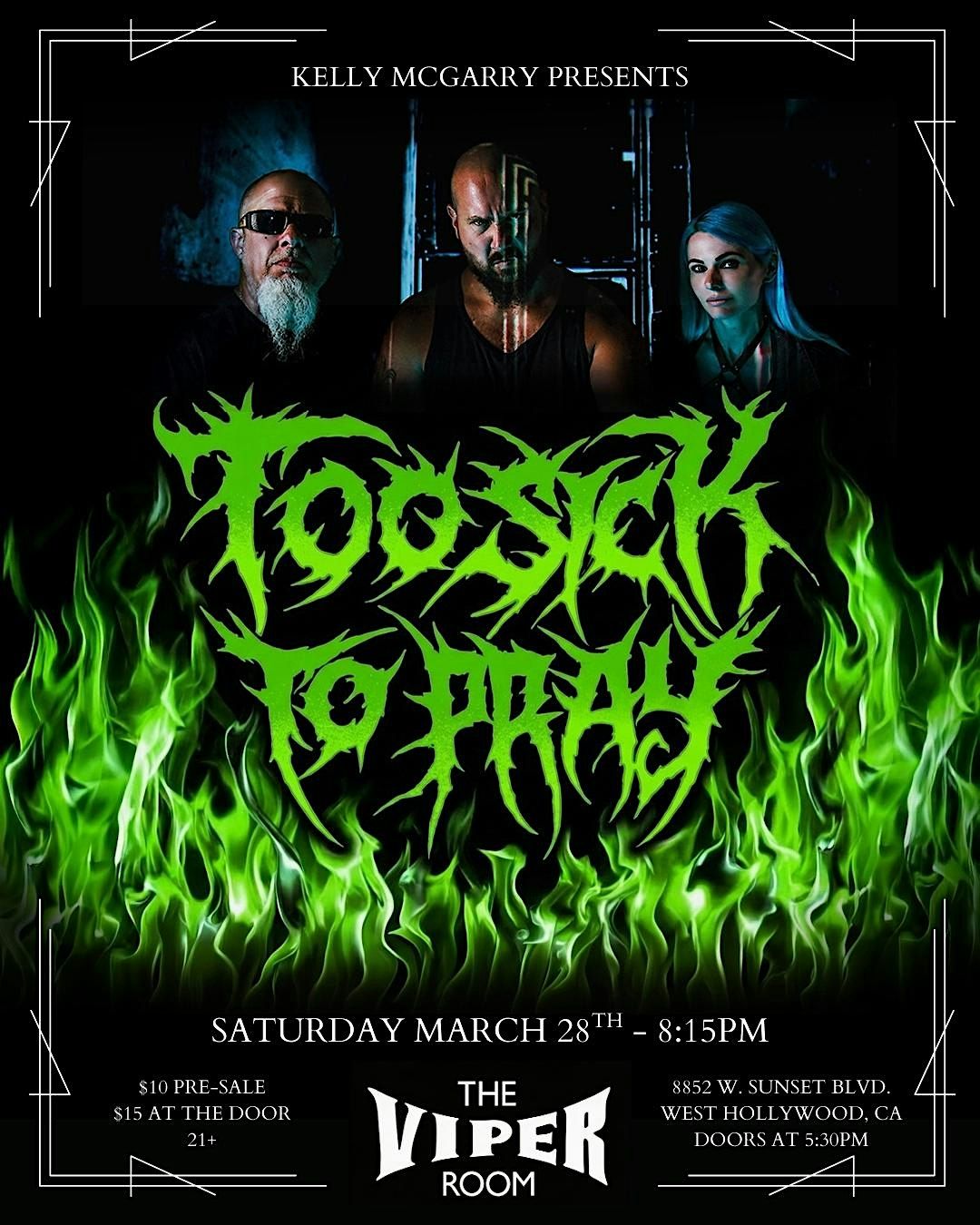 Get ready for a night that's sick AF with Kelly McGarry presents Too Sick To Pray live and in person at the iconic Viper Room! Experience the Ventura County metal scene's finest with the raw vocals of Jake Weeces, killer guitar riffs of Jay Rivera and groovy patterns by Brittney Hendricks aka Digi Drums. Bring your crew, grab a drink and tip your bartender. Doors at 5:30pm.