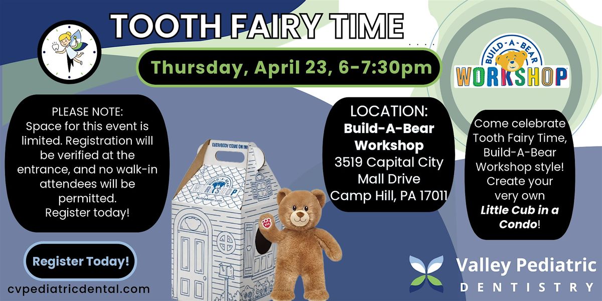 Join us for Tooth Fairy Time at Build-A-Bear Workshop at the Capital City Mall on Thursday, April 23 from 6:00 PM–7:30 PM!