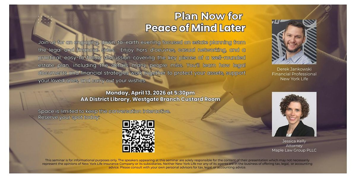 Join Jessica Kelly of Maple Law Group and Derek Jankowski of New York Life for hors d’oeuvres, networking, and an interactive conversation on estate planning.