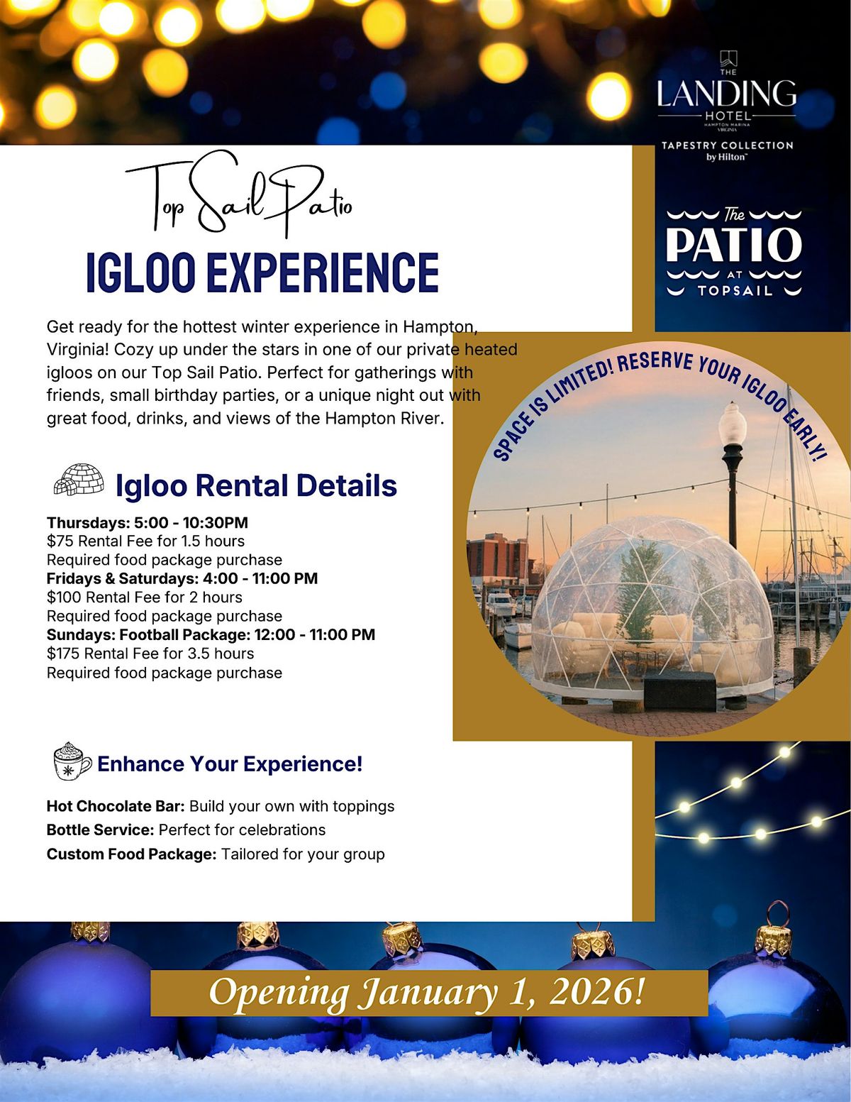 Get ready for the hottest winter experience in Hampton, Virginia! Cozy up under the stars in one of our private heated igloos on our Top Sail Patio. Perfect for gatherings with friends, small birthday parties, or a unique night out with great food, drinks, and views of the Hampton River.