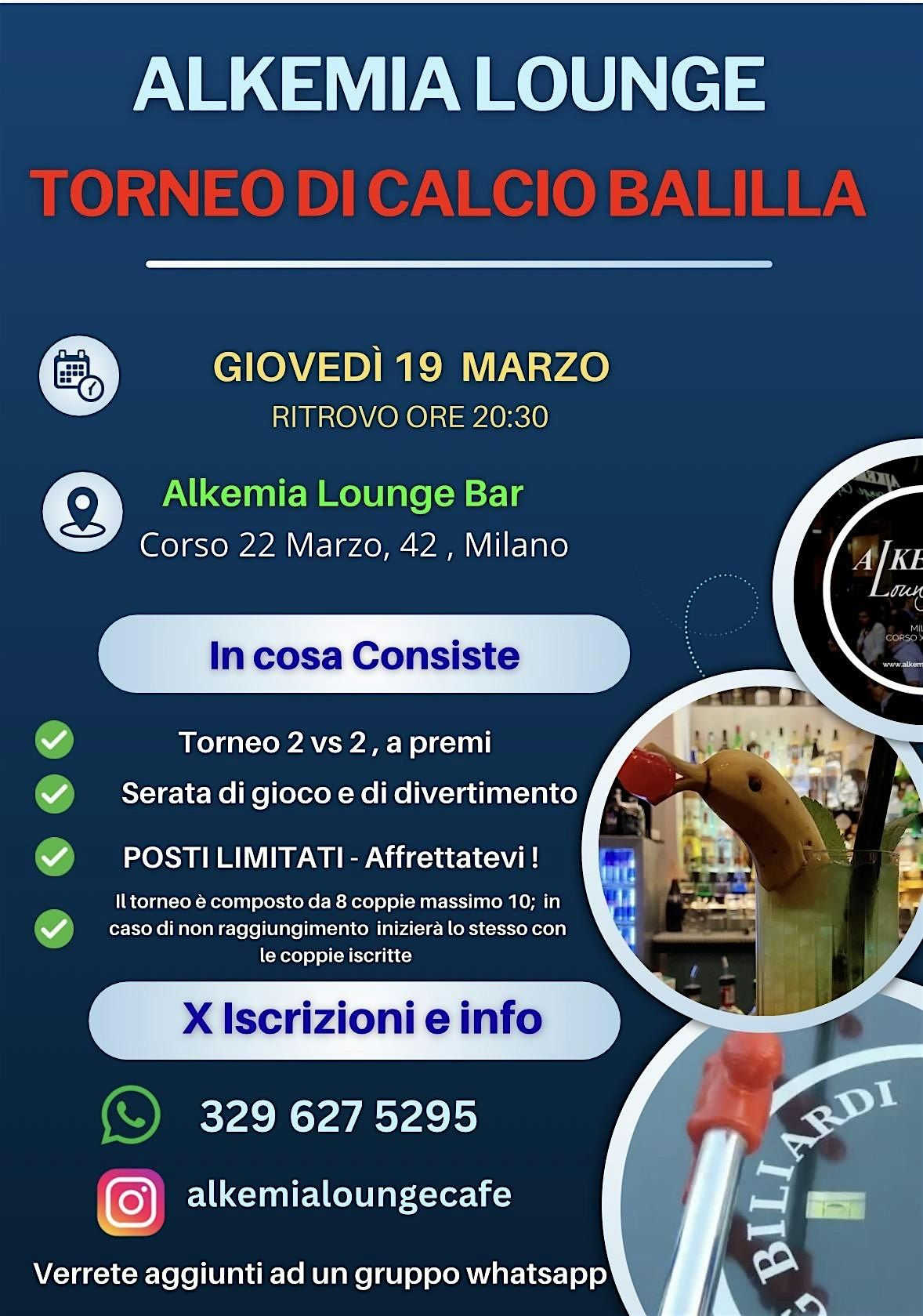 Giovedì 19 marzo ti aspettiamo all’Alkemia Lounge Bar di Milano per una nuova serata di Torneo di Calcio Balilla 2 vs 2 all’insegna del divertimento e della competizione.