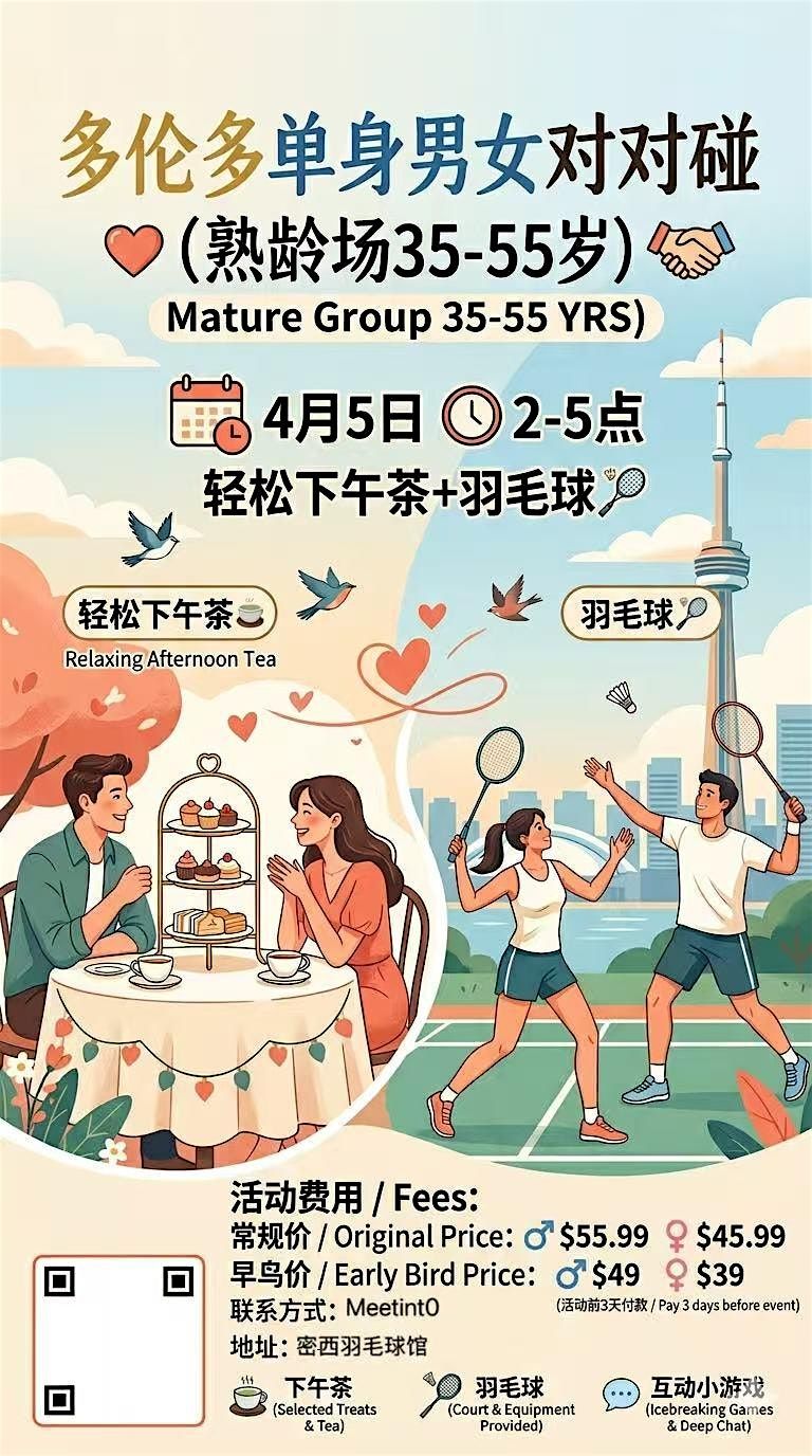 Looking to meet fun, like-minded singles aged 35 to 55? Come join our lively in-person badminton mixer in Toronto! It’s a casual, social event where you can enjoy some great badminton action, make new friends, and maybe even find a spark while having a blast. All skill levels welcome—just bring your energy and good vibes!