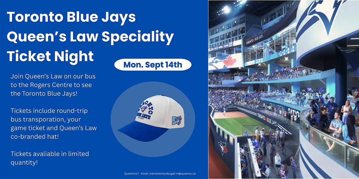 Queen’s Law Blue Jays Night Sept 14. Bus, ticket, and co-branded hat included. Limited spots—secure yours early!About this Event