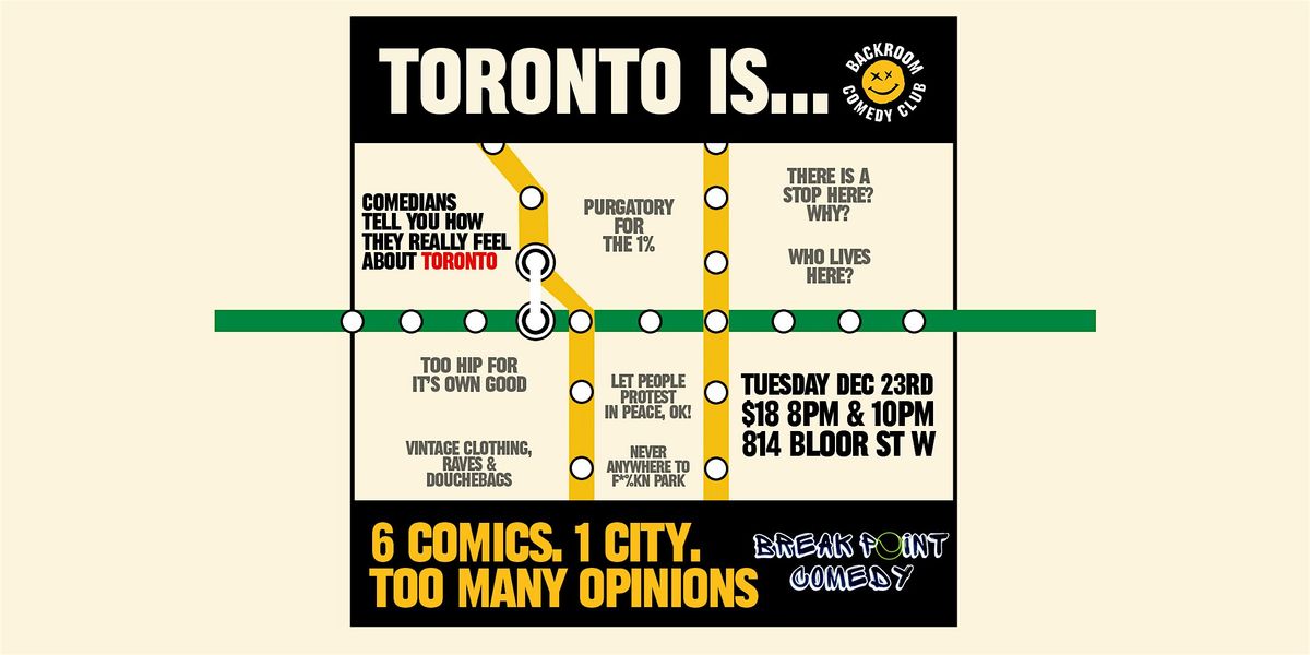 Welcome to the Toronto is... Comedians telling you how they feel about Toronto event! Get ready to laugh your socks off at the Backroom Comedy Club on Dec 23, 2025 at 8:00 & 10 PM (Eastern Time). Our hilarious comedians will share their thoughts and jokes about the wonderful city of Toronto. Join us for a night of fun and laughter as we celebrate all things Toronto in the best way we know how - through comedy! Don't miss out on this unique and entertaining event!